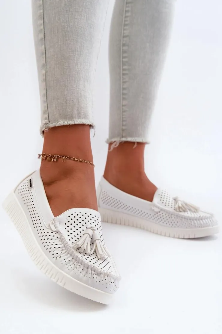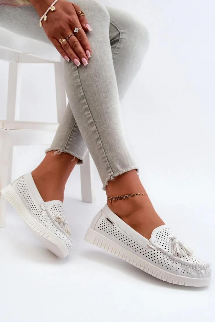 Mokasyny damskie wykonane z ekologicznej skóry. Osadzone na platformie. Noski zaokrąglone. Przód ozdobiony małymi frędzlami. Model ten posiada miękką wkładkę ze skóry naturalnej, która zapewni wygodę podczas noszenia. Klasyczny fason, który dopasujesz do casualowych oraz eleganckich stylizacji. Przy wyborze rozmiaru prosimy sugerować się tabelą rozmiarów.