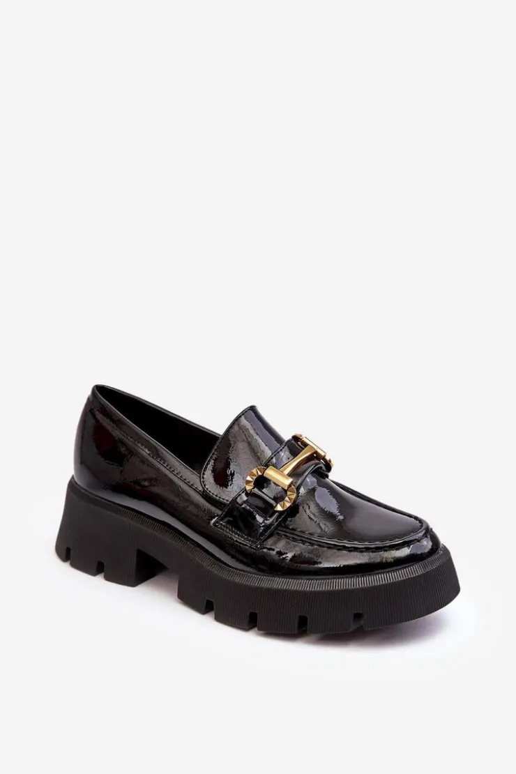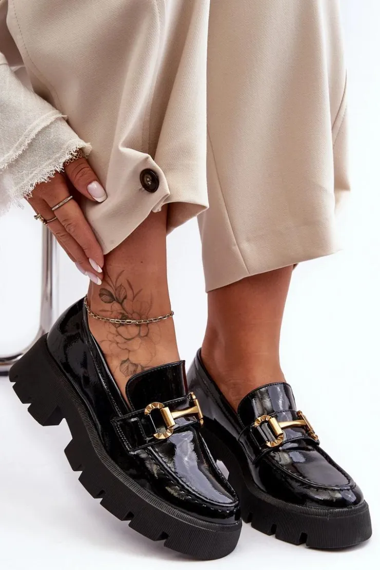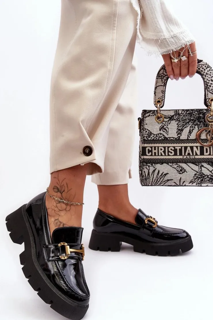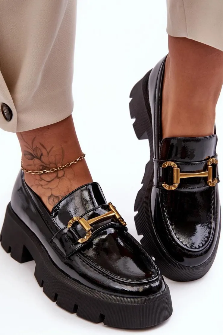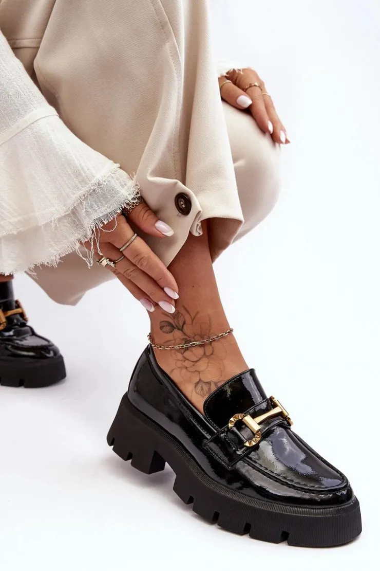 Boto Mokasyny Damskie Lakierowane*Damskie Lakierowane Półbuty Loafery Z Ozdobą Czarne Peuria