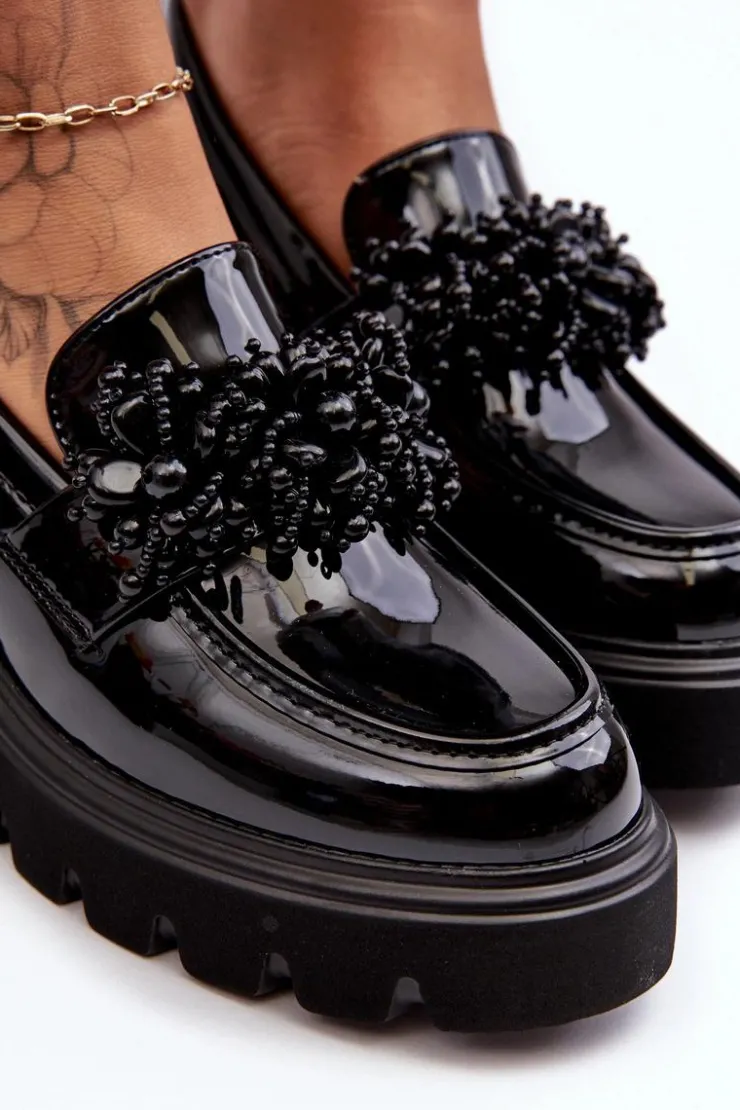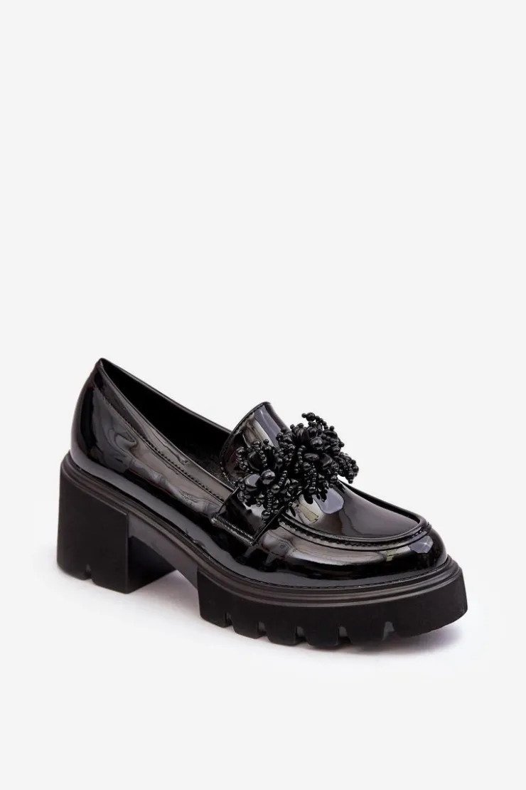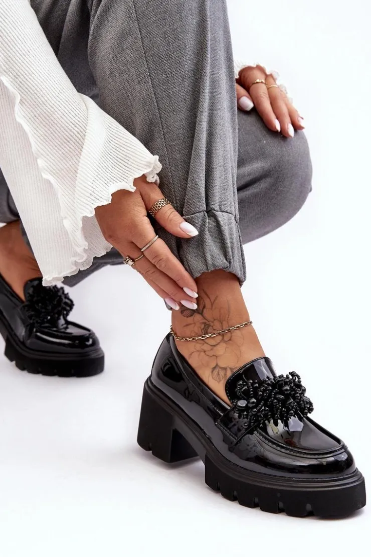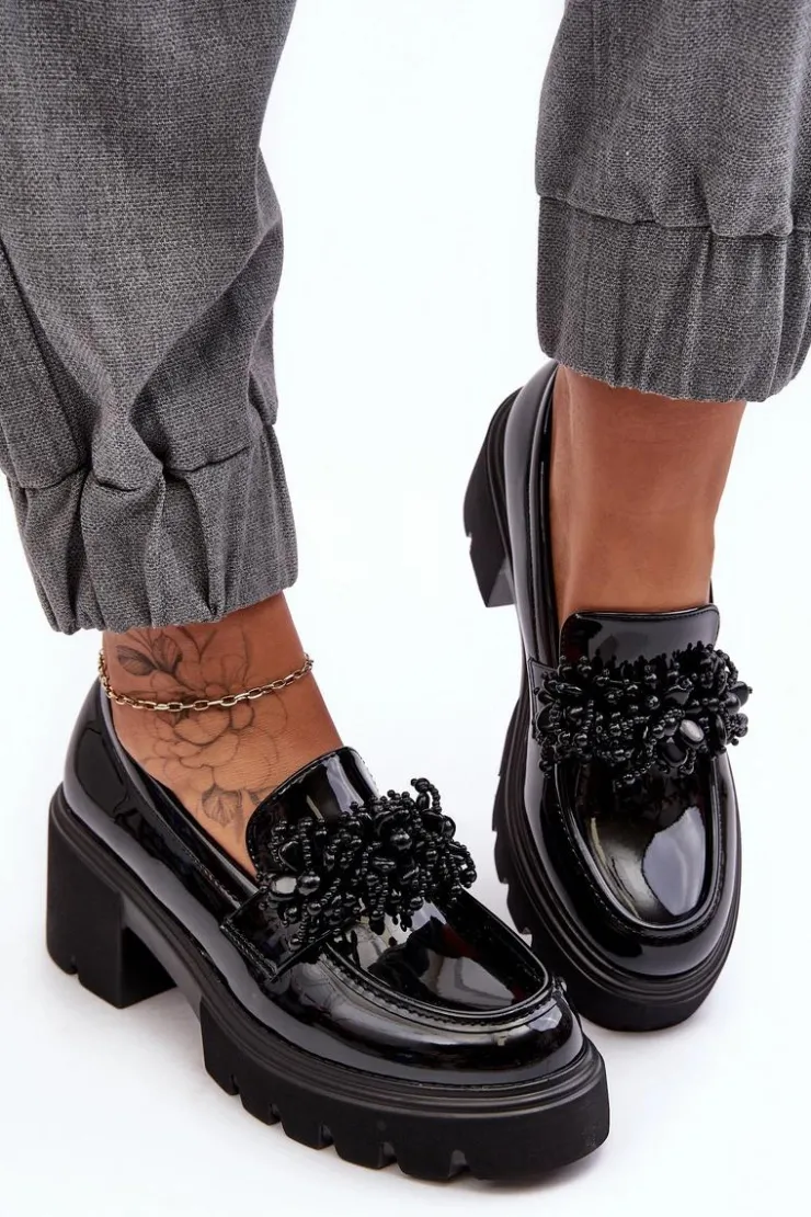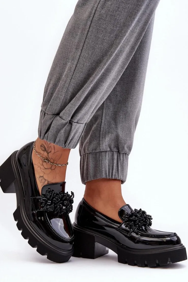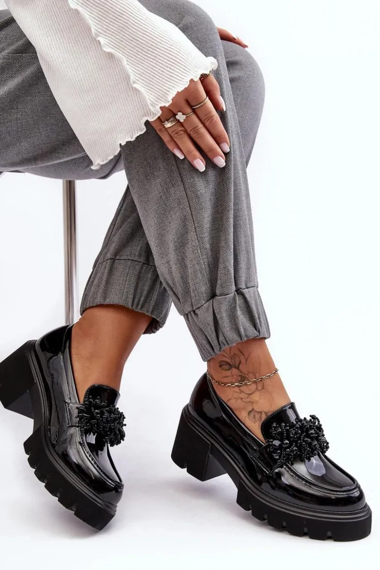 Stylowe półbuty damskie z ozdobą na pasku. Osadzone grubej podeszwie i masywnym, niskim obcasie. Noski zaokrąglone. Usztywniony zapiętek. Eko skórzana wkładka zapewni komfort podczas użytkowania. Model ten będzie idealny do wielu jesiennych stylizacji! Przy wyborze rozmiaru prosimy sugerować się tabelą rozmiarów.