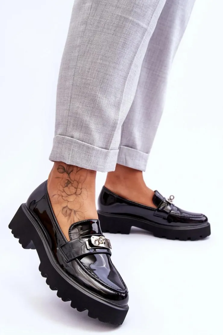 Mokasyny damskie zostały wykonane z eko skóry. Osadzono je na platformie i płaskim obcasie ze żłobieniami. Podeszwa została wykonana z tworzywa sztucznego. Miękka wkładka z eko skóry zapewni komfortowe użytkowanie. Mokasyny posiadają z przodu ozdobny element. Świetny model do wielu eleganckich i casualowych stylizacji. Przy wyborze rozmiaru prosimy sugerować się tabelą rozmiarów.