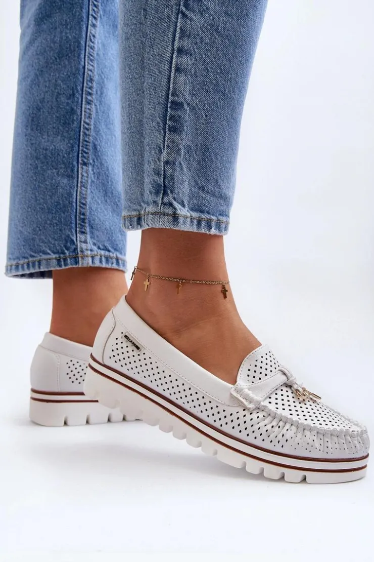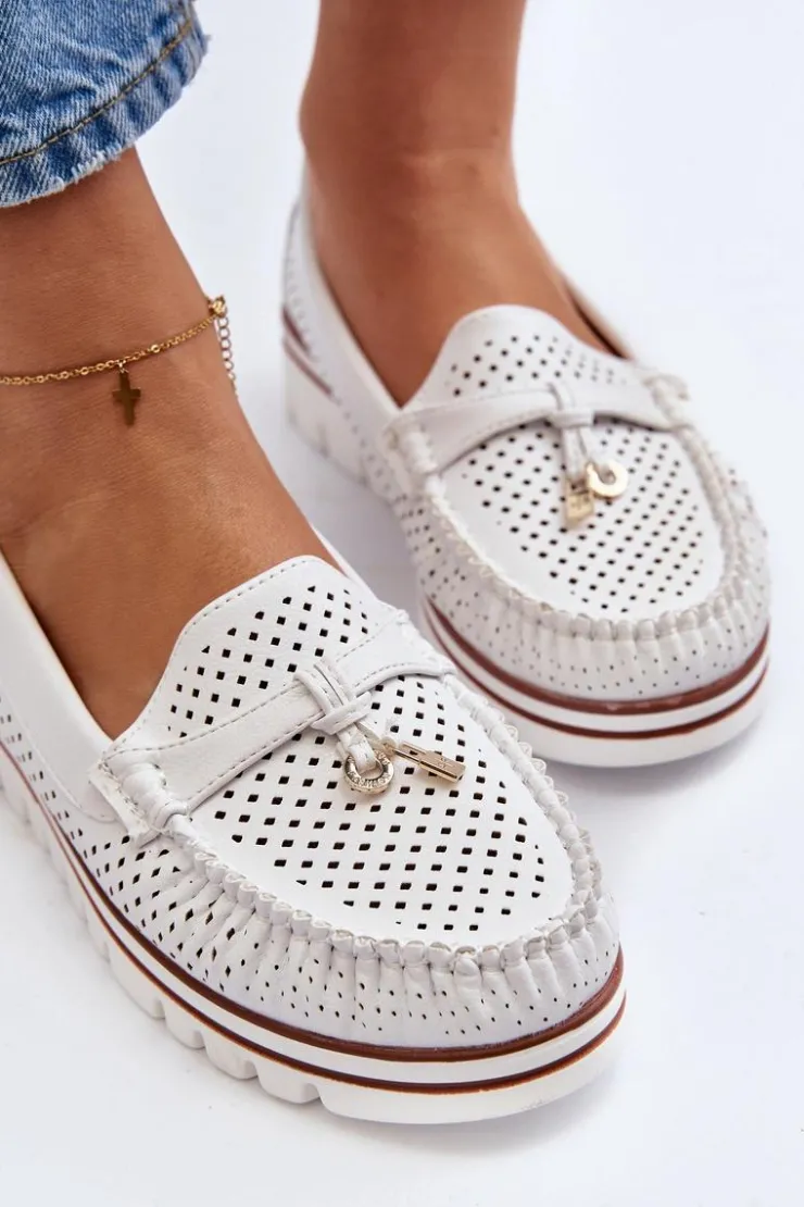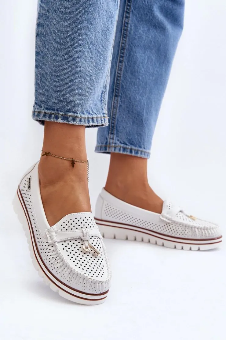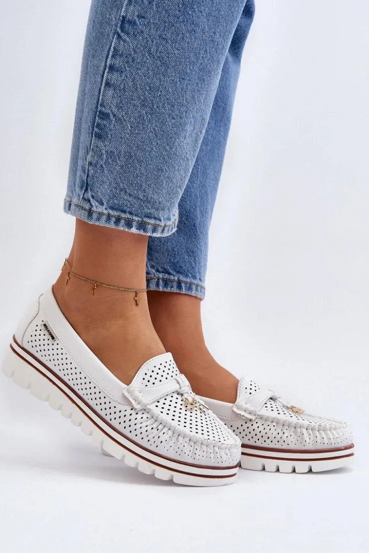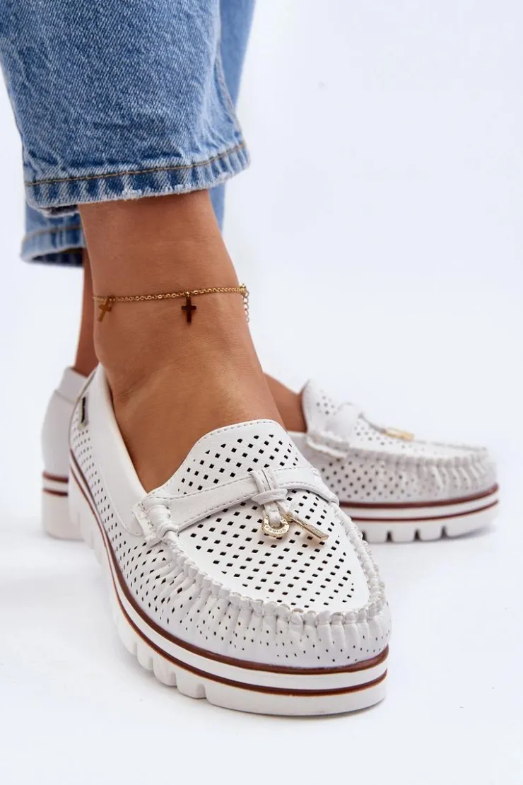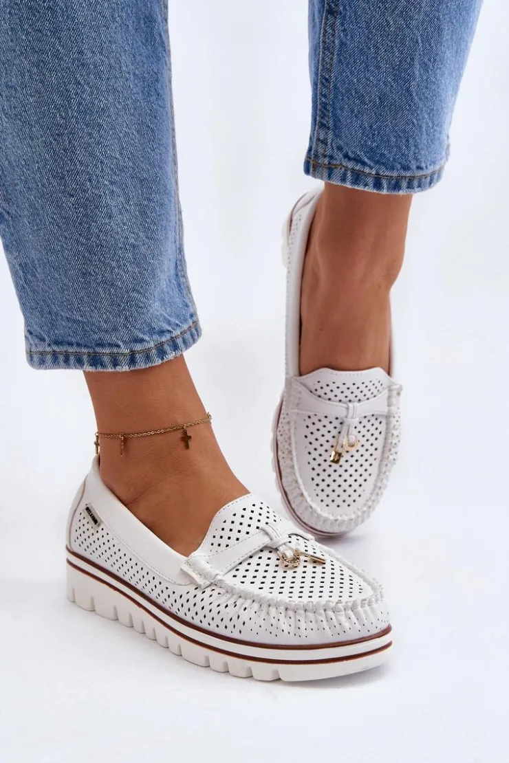 Ażurowe mokasyny wykonane z eko skóry. Osadzone na platformie. Miękka wkładka ze skóry naturalnej zapewni wygodę podczas noszenia. Świetny model do wielu wiosenno-letnich stylizacji! Przy wyborze rozmiaru prosimy sugerować się tabelą rozmiarów.