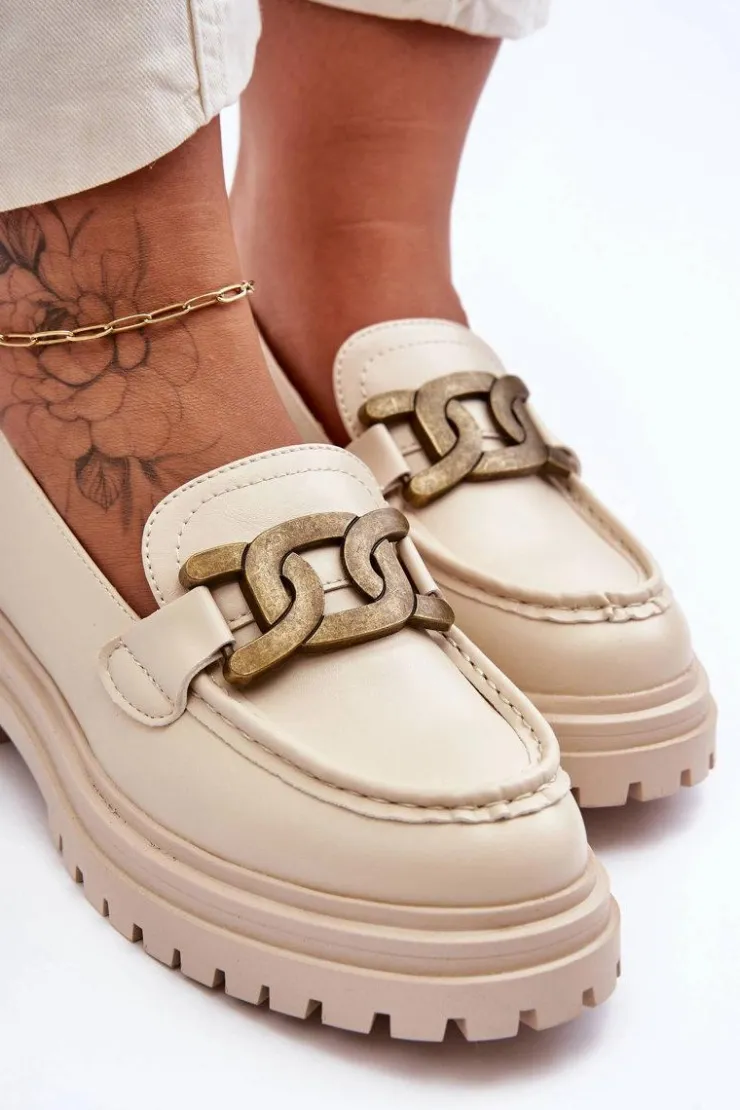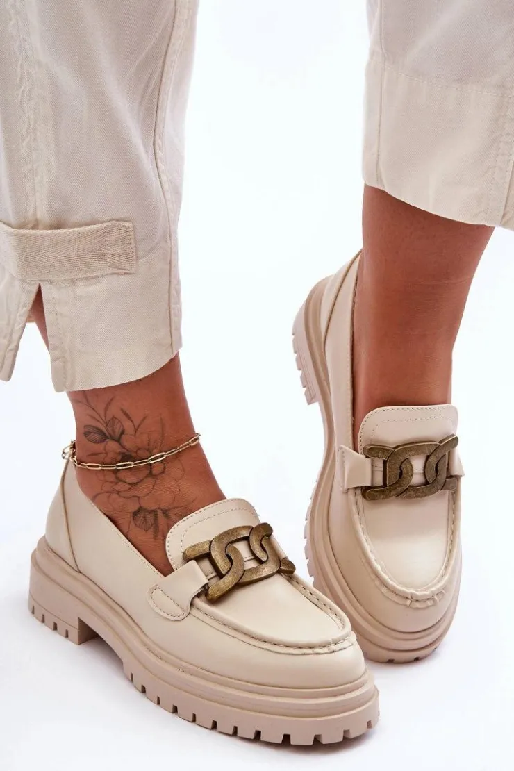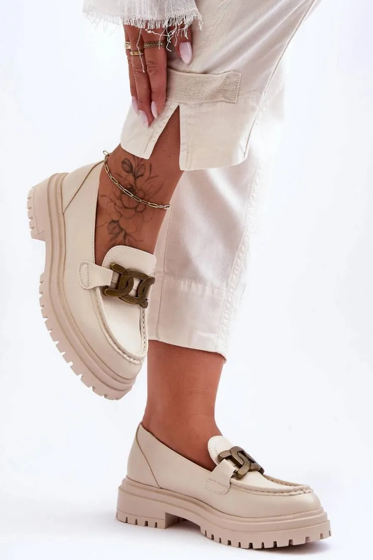 Stylowe, damskie mokasyny świetnie sprawdzą się do wielu stylizacji! Wykonane zostały z eko skóry. Model ten osadzony jest na masywnej platformie i płaskim obcasie. Z przodu znajduje się ozdoba. Koniecznie powinnaś je mieć! Przy wyborze rozmiaru prosimy sugerować się tabelą rozmiarów.