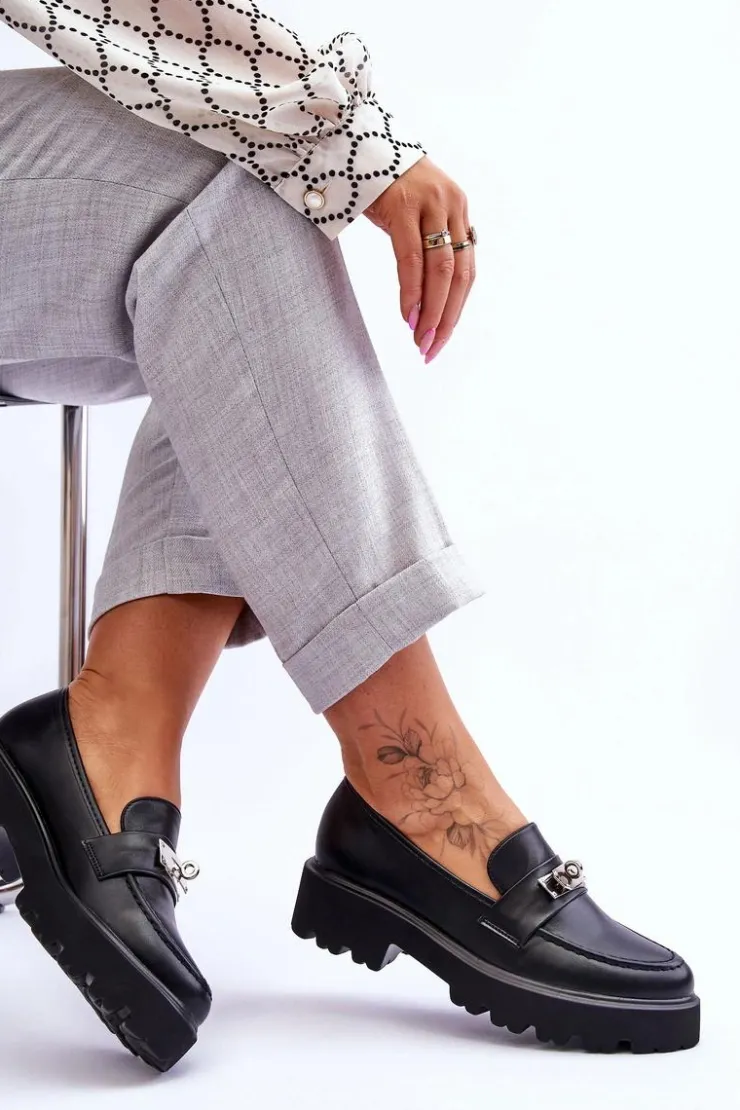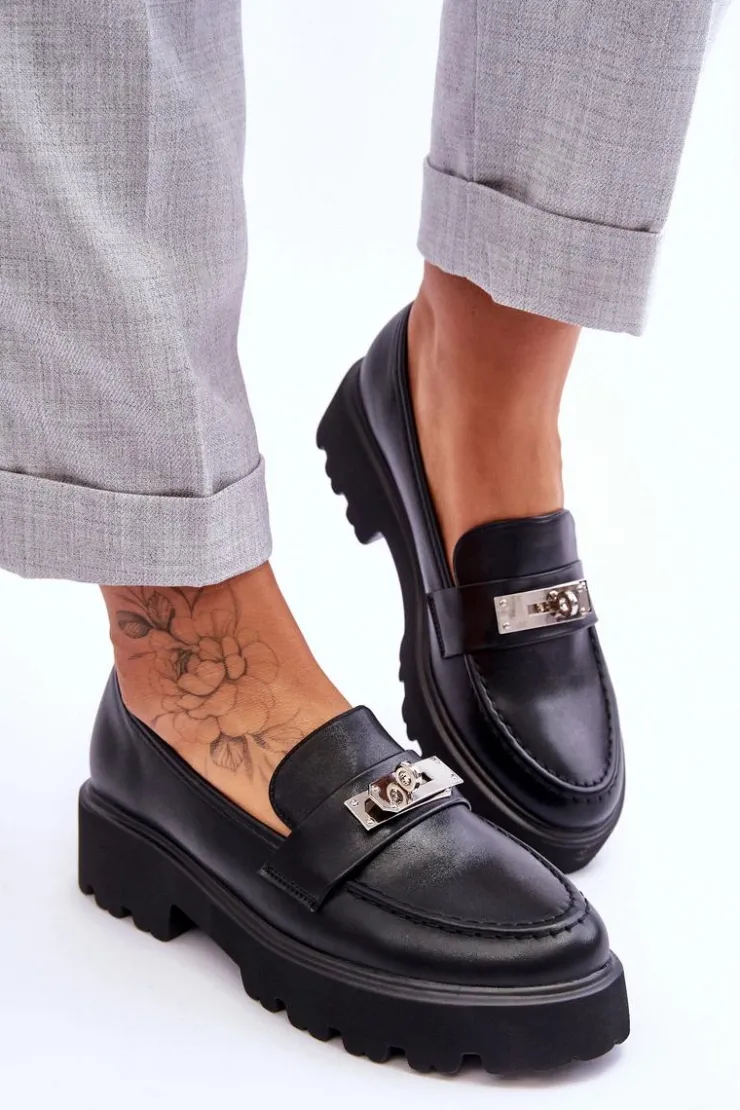 Mokasyny damskie zostały wykonane z eko skóry. Osadzono je na platformie i płaskim obcasie ze żłobieniami. Podeszwa została wykonana z tworzywa sztucznego. Miękka wkładka z eko skóry zapewni komfortowe użytkowanie. Mokasyny posiadają z przodu ozdobny element. Świetny model do wielu eleganckich i casualowych stylizacji. Przy wyborze rozmiaru prosimy sugerować się tabelą rozmiarów.