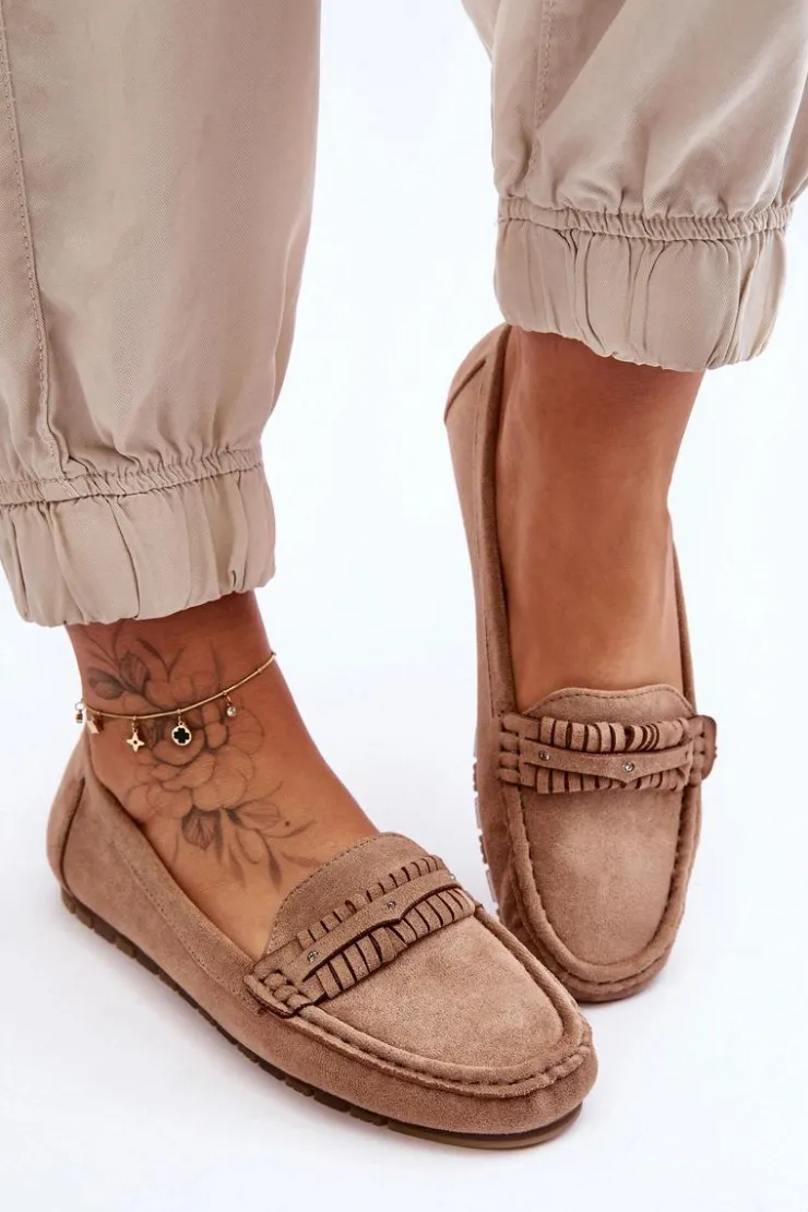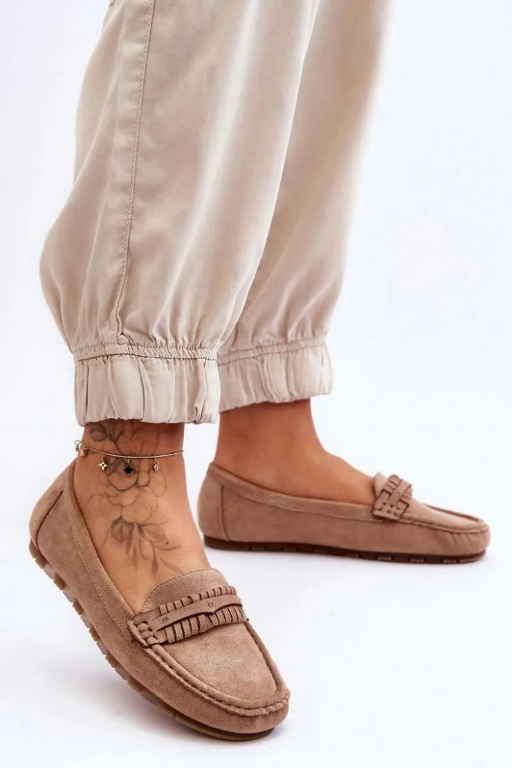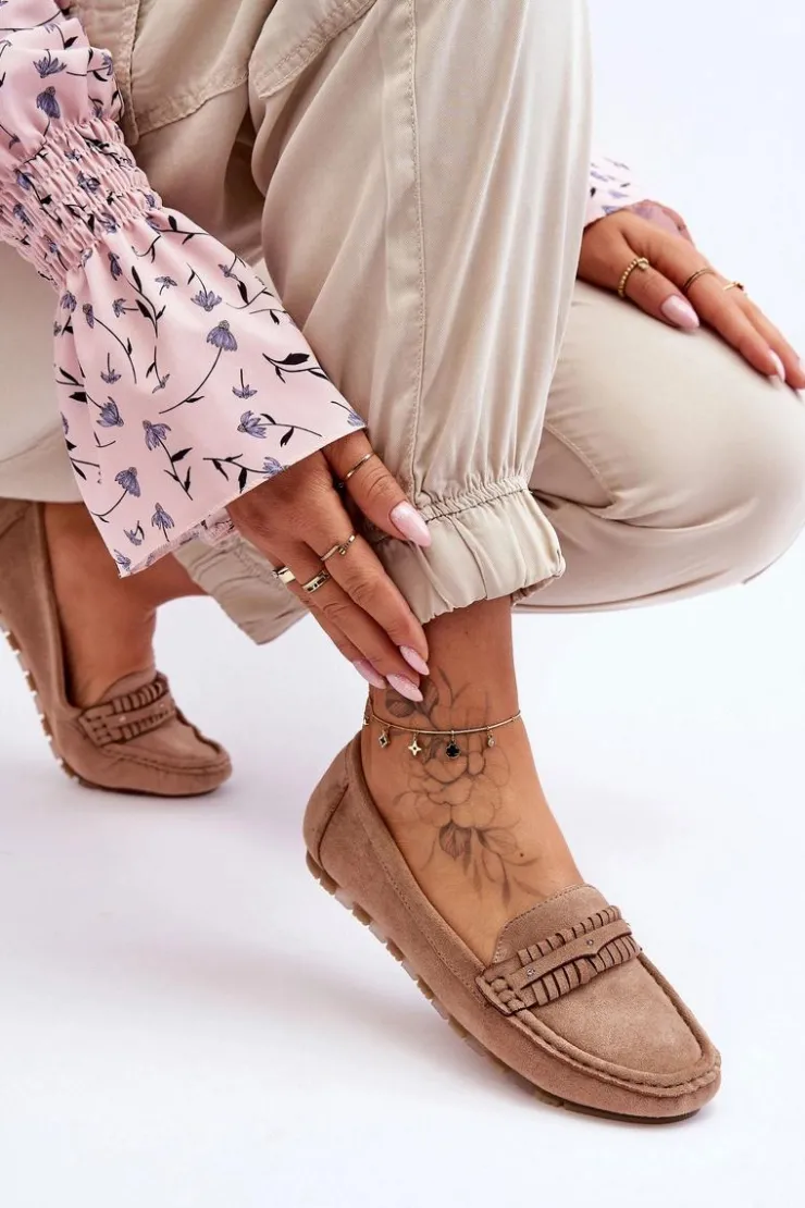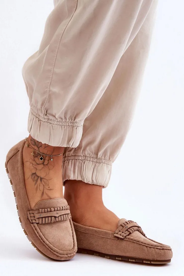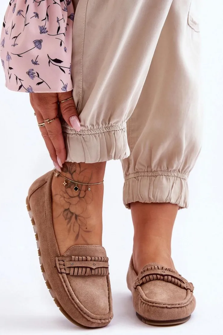 Idealne na wiele okazji klasyczne mokasyny damskie zostały wykonane z eko zamszu. Model ten posiada na przodzie ozdobny paseczek z ćwiekami. Mokasyny osadzono na niskiej platformie. Miękka wkładka z eko skóry zapewni komfort podczas użytkowania obuwia. Model ten posiada kwadratowy nosek. Przy wyborze rozmiaru prosimy sugerować się tabelą rozmiarów.
