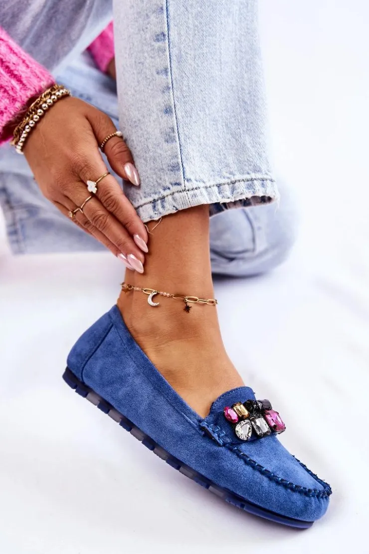 Damskie mokasyny zostały wykonane z miłego w dotyku eko zamszu. Na przodzie znajdują się ozdobne kamienie. Mokasyny zostały osadzone na delikatnej platformie, z antypoślizgową podeszwą. Zapiętek jest delikatnie usztywniany. Miękka wkładka jest dodatkowo perforowana i wykonana z naturalnej skóry. Świetny model do wielu stylizacji! Przy wyborze rozmiaru prosimy sugerować się tabelą rozmiarów.