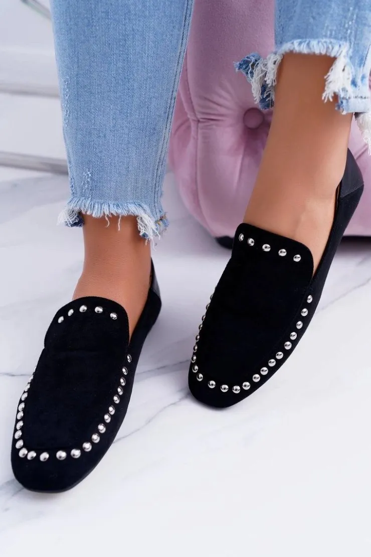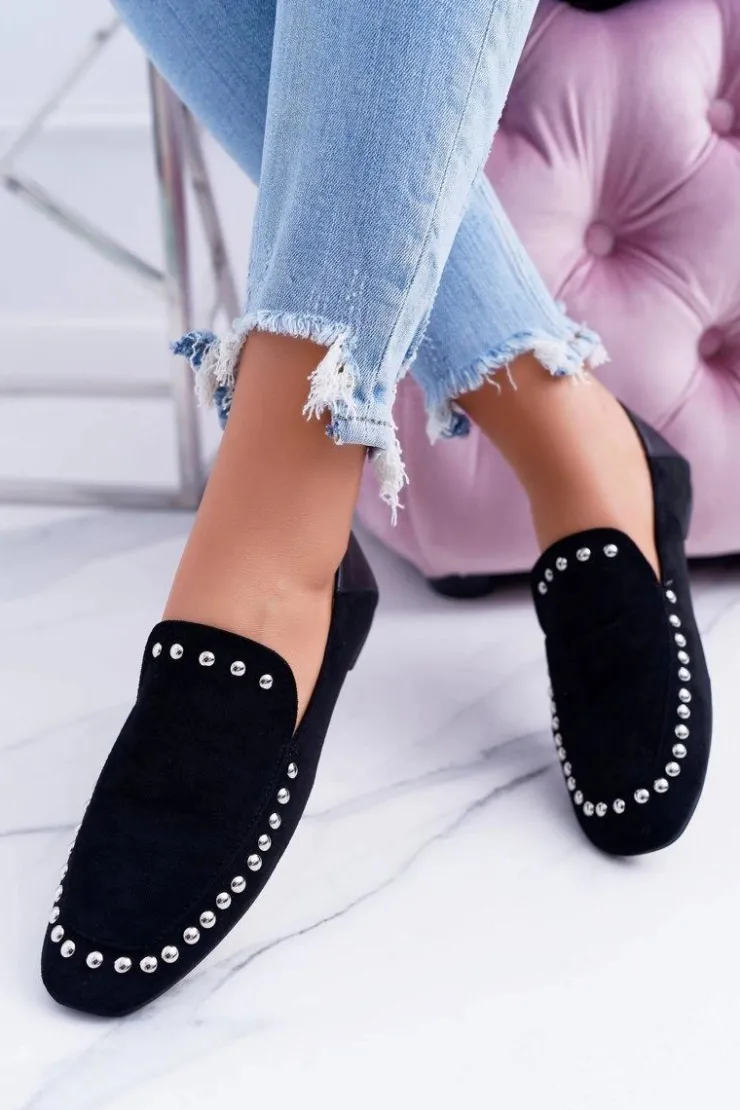 Boto Mokasyny Damskie Zamszowe*Lu Boo Damskie Czarne Lordsy Baleriny z Dżetami Planta