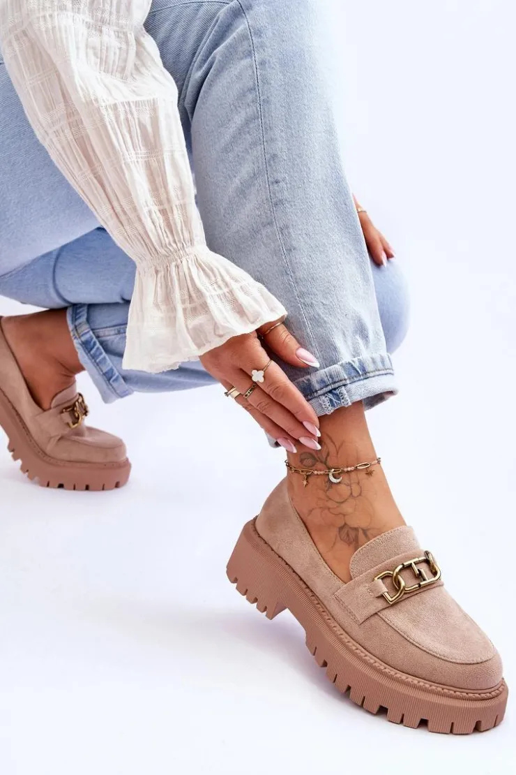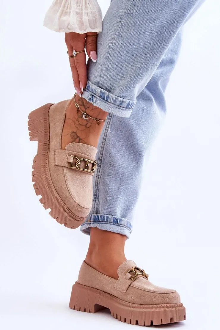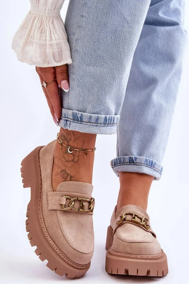 Damskie, klasyczne mokasyny zostały wykonane z eko zamszu. Na przodzie posiadają ozdobę. Model ten został osadzony na masywnym, płaskim obcasie i platformie. Mokasyny posiadają wkładkę z miękkiej eko skóry. Świetny model na sezon wiosenno-jesienny! Koniecznie powinnaś je mieć!Przy wyborze rozmiaru prosimy sugerować się tabelą rozmiarów.