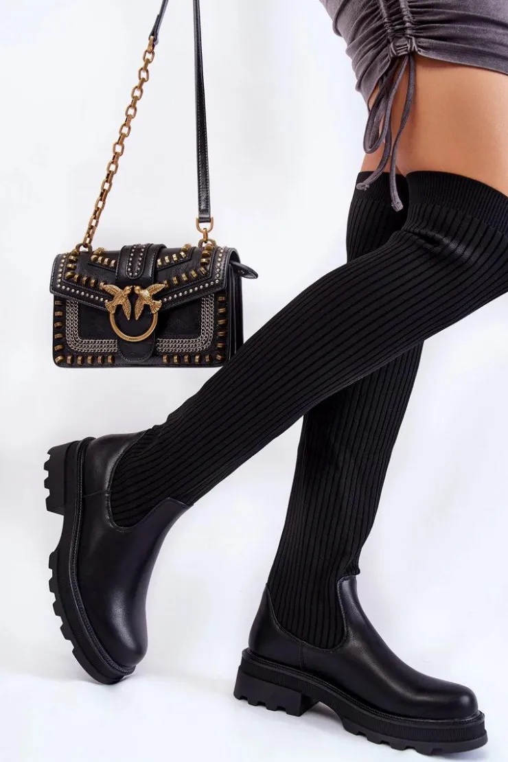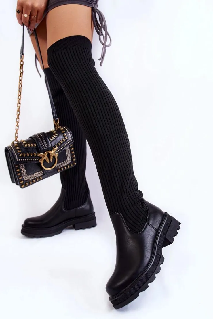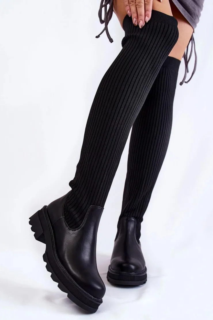 Modne kozaki w stylu workerów zostały wykonane z połączenia eko skóry oraz prążkowanej, elastycznej tkaniny. Model wsuwany, z cholewką za kolano. Kozaki osadzono na płaskim obcasie i delikatnej platformie ze żłobieniami. Buty te posiadają materiałową wkładkę oraz zaokrąglony nosek. Zapiętek jest delikatnie usztywniany. Świetnie będą prezentować się z sukienkami lub spódniczkami mini. Przy wyborze rozmiaru prosimy kierować tabelą rozmiarów.
