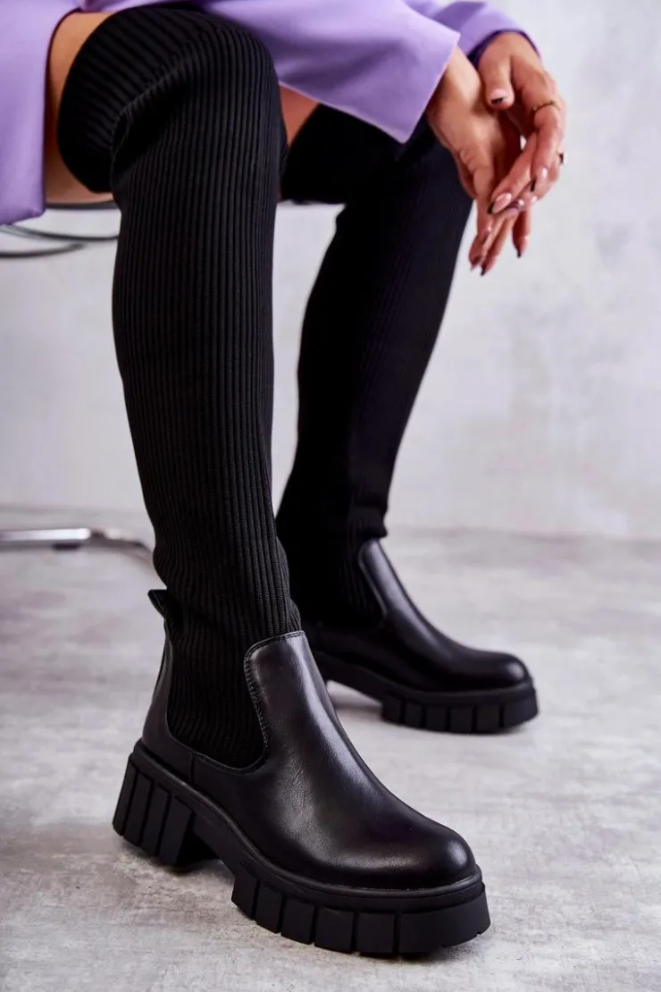 Modne damskie kozaki zostały wykonane z połączenia eko skóry oraz prążkowanej tkaniny. Cholewka za kolano. Model osadzony na płaskim obcasie i delikatnej platformie ze żłobieniami. Buty te posiadają ocieplaną wkładkę. Nosek zaokrąglony. Model wsuwany. Świetnie będą prezentować się z sukienkami lub spódniczkami mini. Przy wyborze rozmiaru prosimy kierować tabelą rozmiarów.