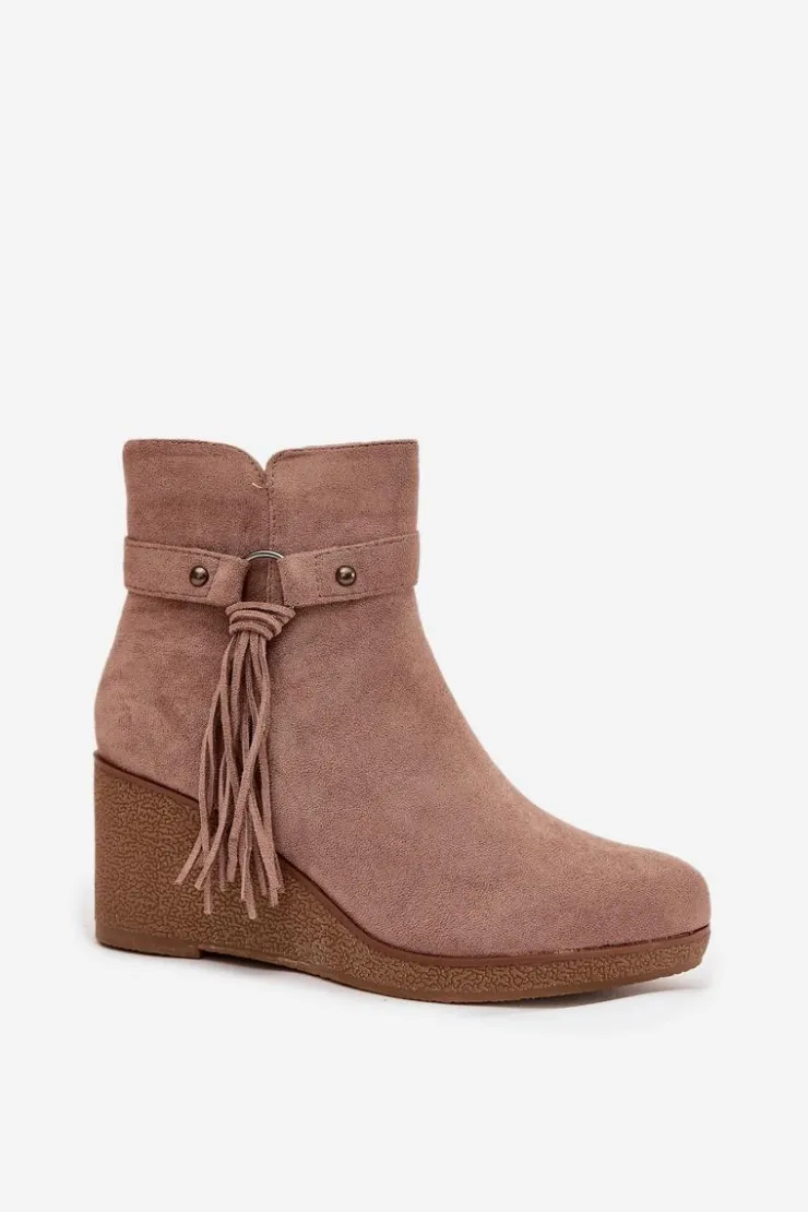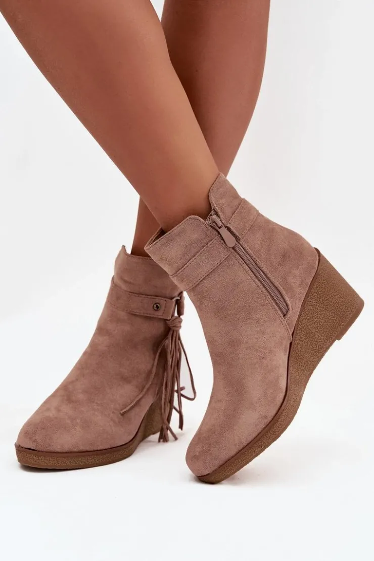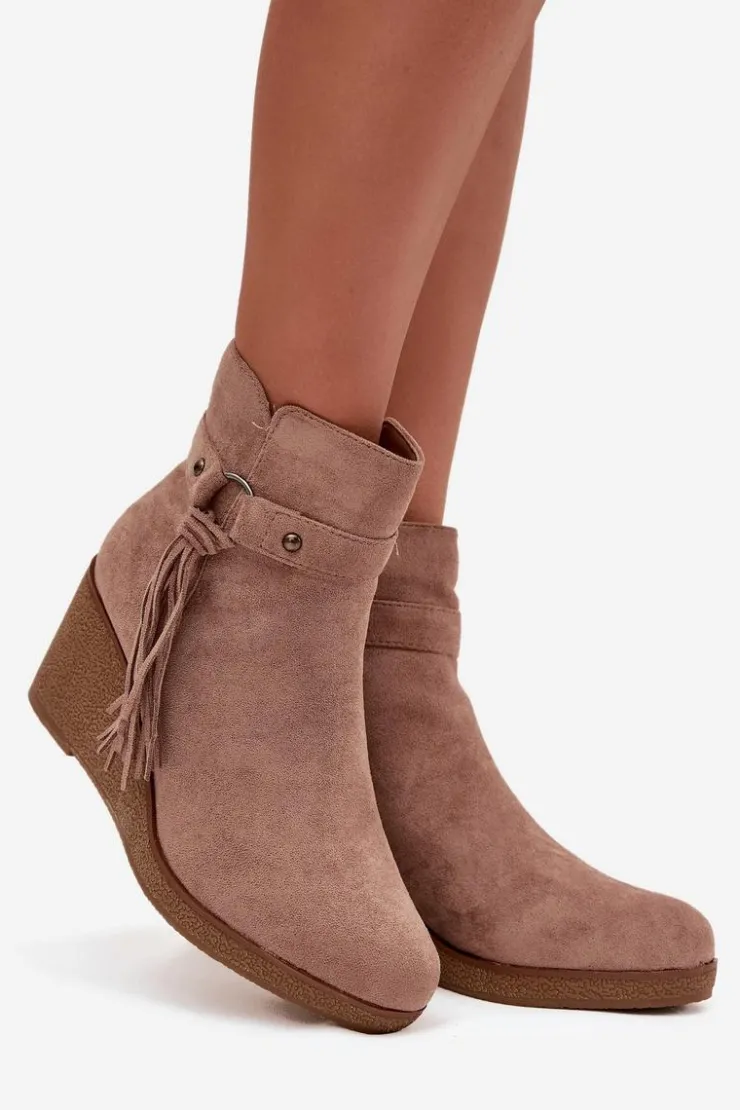 Botki damskie z eko zamszu to modny i wygodny wybór na chłodniejsze dni. Wnętrze butów zostało ocieplone kocem obuwniczym, dzięki czemu zapewniają komfort i ciepło. Zamek po boku ułatwia zakładanie i zdejmowanie, a całości wyjątkowego charakteru nadaje ozdobny pasek z frędzlami, który podkreśla stylowy wygląd modelu. To obuwie doskonale sprawdzi się w codziennych stylizacjach – pasuje zarówno do spodni, jak i do sukienek czy spódnic, dodając im modnego akcentu.