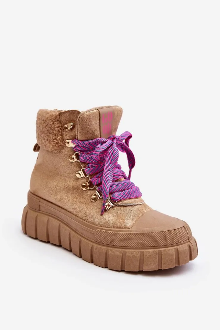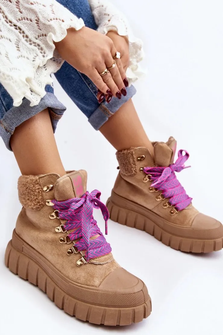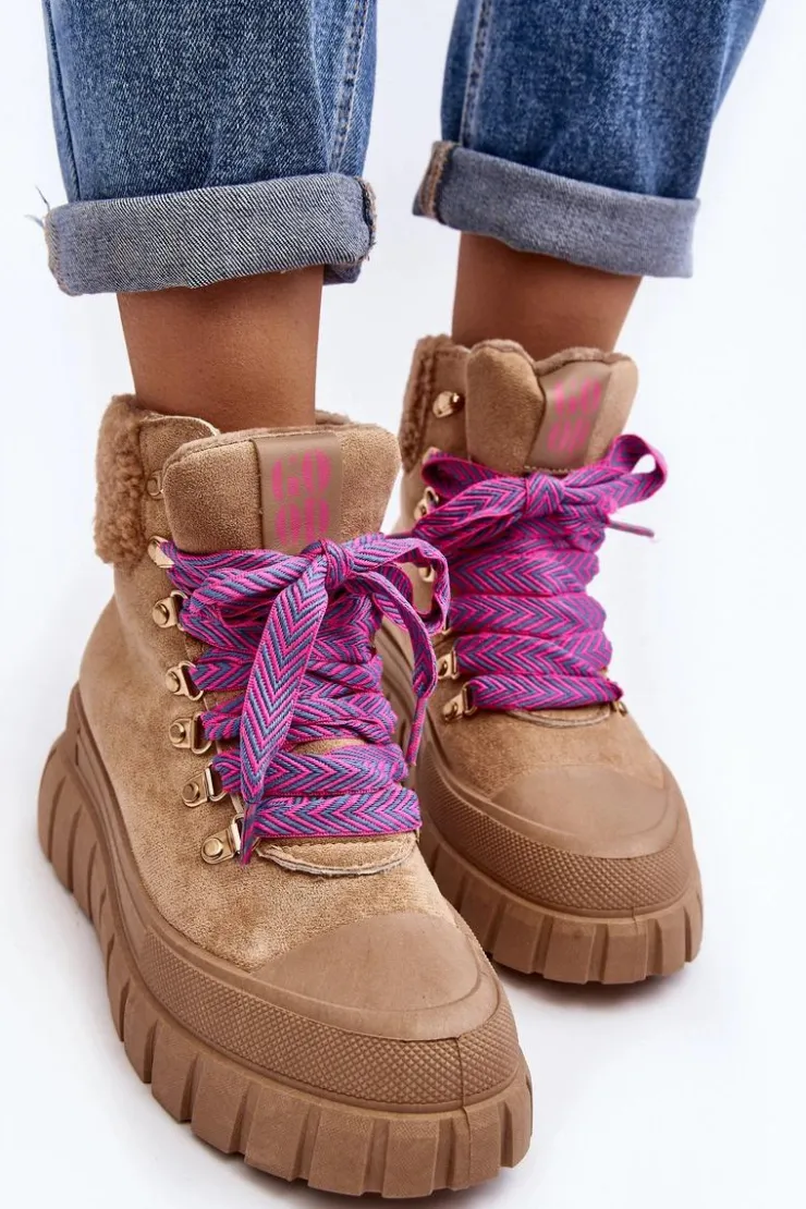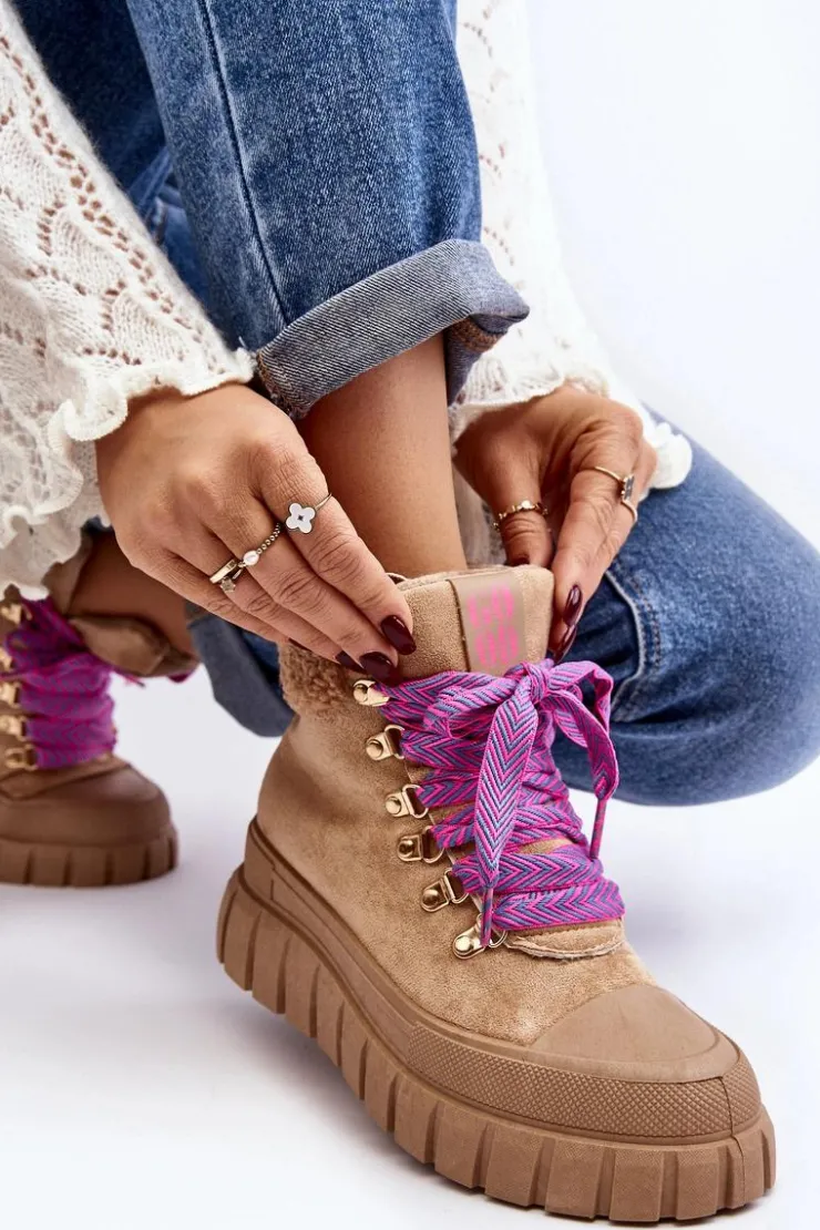 Damskie trapery zostały wykonane z eko zamszu. Osadzone na masywnej platformie z gumowego tworzywa. Wnętrze zostało ocieplone kocem obuwniczym, co zapewnia komfort i ciepło podczas chłodniejszych dni. Noski są zaokrąglone, co dodaje butom subtelnego uroku. Model klasycznie sznurowany. Modne obuwie stanowi doskonały dodatek do Twojej szafy! Przy wyborze rozmiaru prosimy sugerować się tabelą rozmiarów.