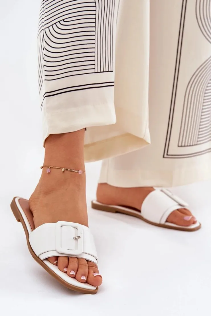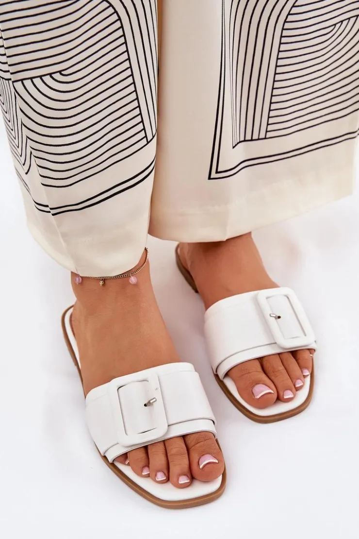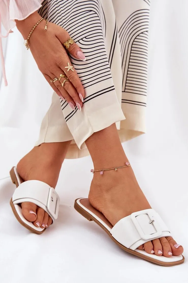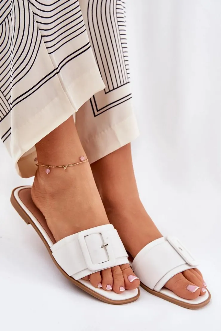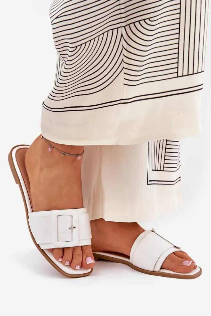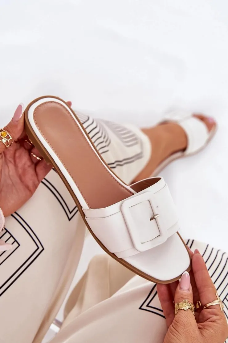 Klasyczne klapki damskie z eko skóry, osadzone na płaskim obcasie, które łączą wygodę z eleganckim wyglądem. Duża klamra na pasku dodaje im subtelnego charakteru. Idealne na co dzień, te klapki doskonale komponują się z letnimi stylizacjami, zapewniając komfort i prostą elegancję przez cały dzień. Przy wyborze rozmiaru prosimy sugerować się tabelą rozmiarów.
