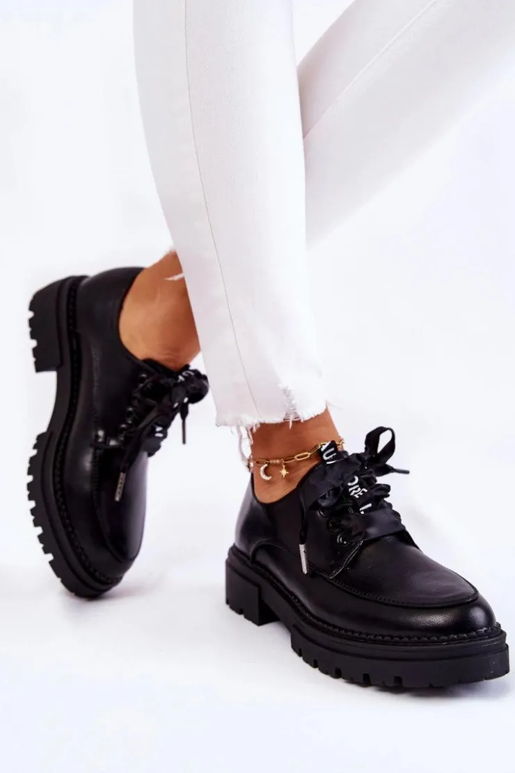 Modne półbuty damskie zostały wykonane z wysokiej jakości eko skórzanych materiałów. Miękka wkładka ze skóry naturalnej to gwarancja komfortu użytkowania nawet przez cały dzień. Sznurowanie w postaci wstążki sprawia, że te buty wyglądają naprawdę elegancko. Płaski, masywny obcas oraz delikatna platforma zapewnią stabilizację na każdym kroku. Ten model sprawdzi się w wielu stylizacjach! Podczas wyboru rozmiaru prosimy sugerować się tabelą rozmiarów.