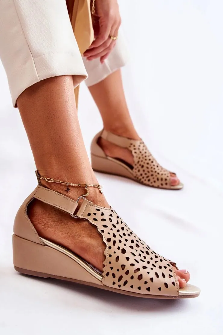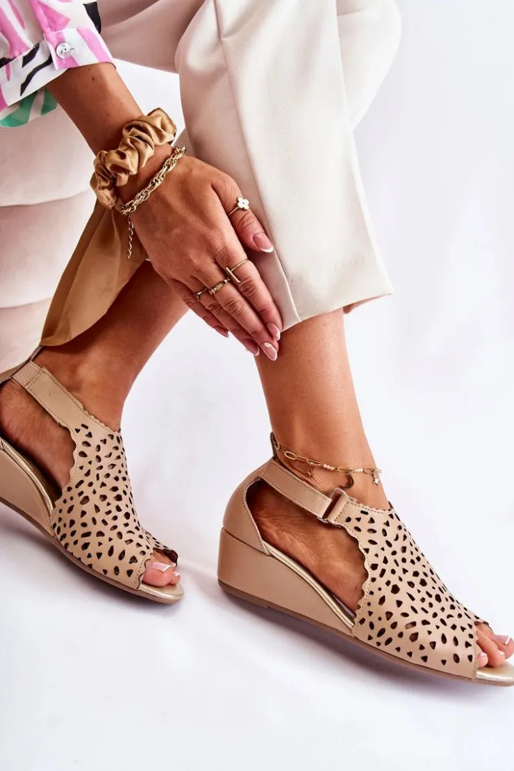 Sandały damskie wykonane z naturalnej skóry w ażurowy wzór. Zapinane przy kostce na rzep. Dodatkowo znajduje się także gumka przy usztywnianym zapiętku, co pozwoli na odpowiednie dopasowanie obuwia. Buty są osadzone na koturnie. Sandały posiadają odkryty, zaokrąglony nosek. Miękka wkładka wykonana także z naturalnej skóry pozwoli na wygodne użytkowanie obuwia. Fason idealny na upalne dni! Przy wyborze rozmiaru prosimy sugerować się tabelą rozmiarów.
