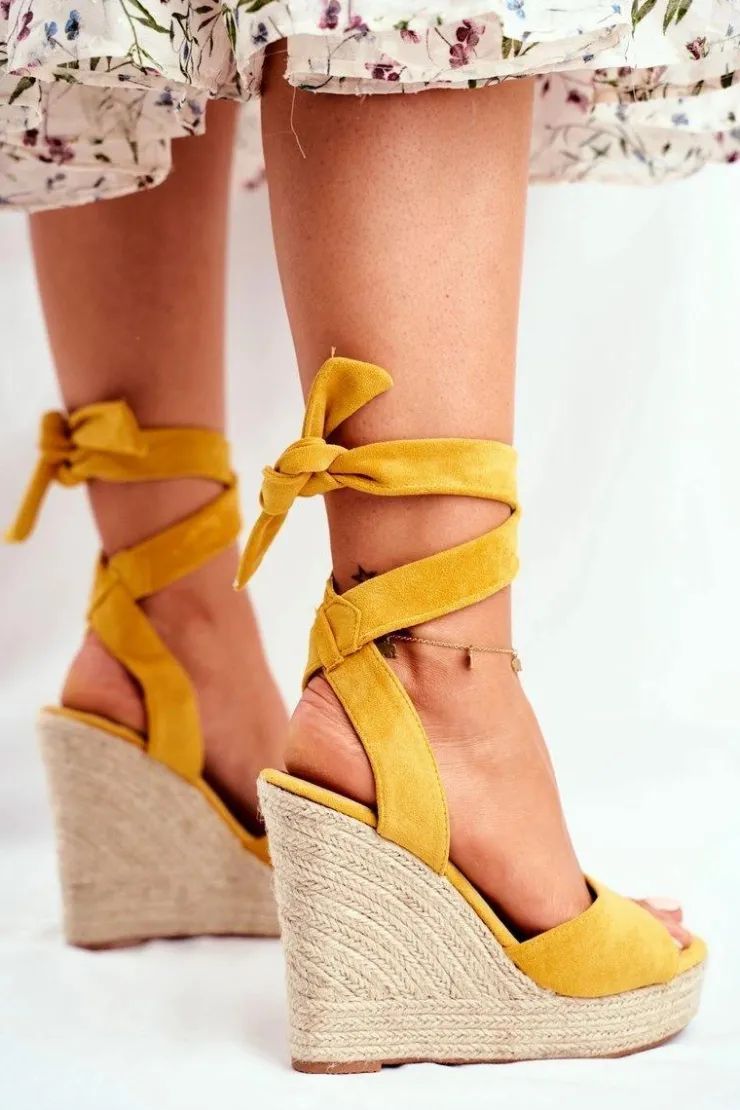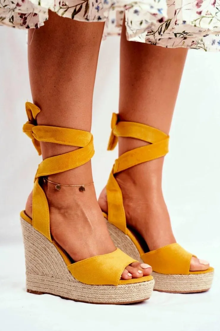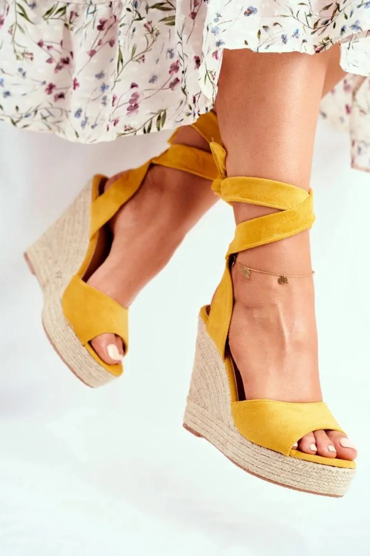Boto Sandały Damskie Na Koturnie Wiązane Żółte Belleza