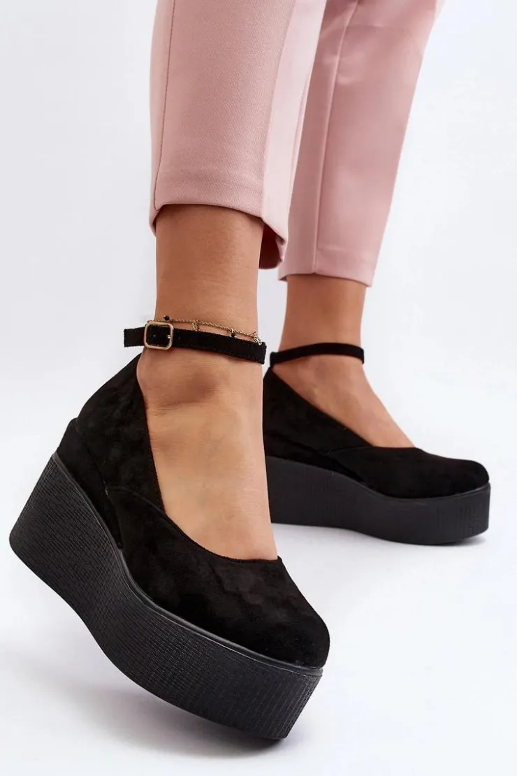 Espadryle damskie osadzone na platformie wraz z koturnem. Wykonane z eko zamszu. Noski zakryte, zaokrąglone. Zapinane na regulowany pasek ze sprzączką. Model ten posiada miękką wkładkę z eko skóry, która zapewni wygodę podczas użytkowania. Idealne do wiosenno-letnich stylizacji! Przy wyborze rozmiaru prosimy sugerować się tabelą rozmiarów.