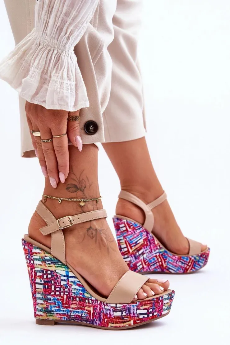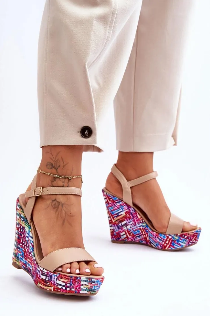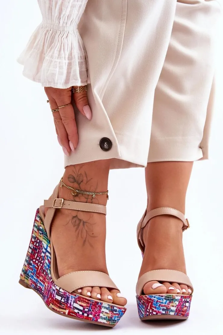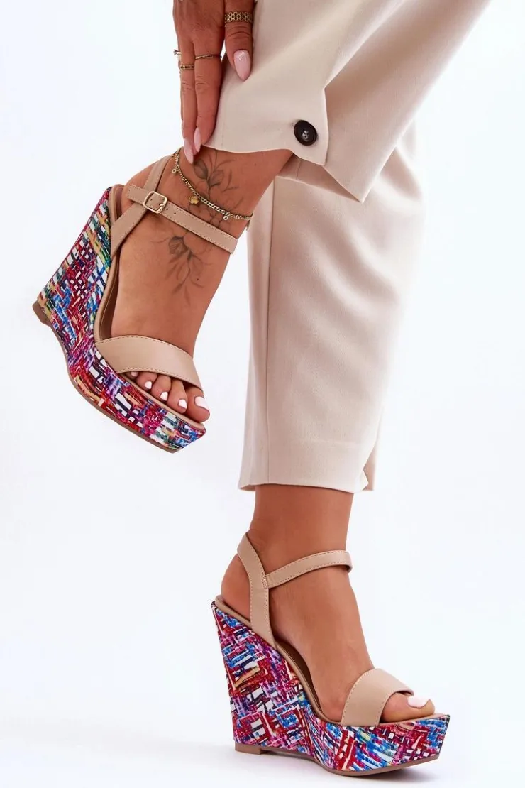 Boto Sandały Na Koturnie*Damskie Sandałki Na Kolorowym Koturnie Beżowe Malibu