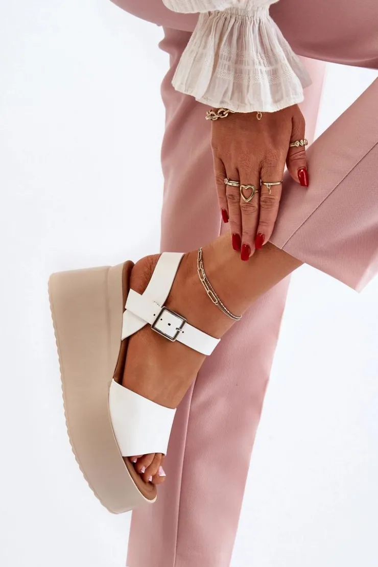 Sandały damskie wykonane z eko skóry. Osadzone na koturnie i platformie, co nie tylko dodaje im modnego wyglądu, ale także zapewnia stabilność podczas chodzenia. Zapinane na regulowany pasek ze sprzączką, łatwo dopasujesz je do swojej stopy. Przy wyborze rozmiaru prosimy sugerować się tabelą rozmiarów. Model ten będzie idealny na letnie spacery czy spotkania na świeżym powietrzu!