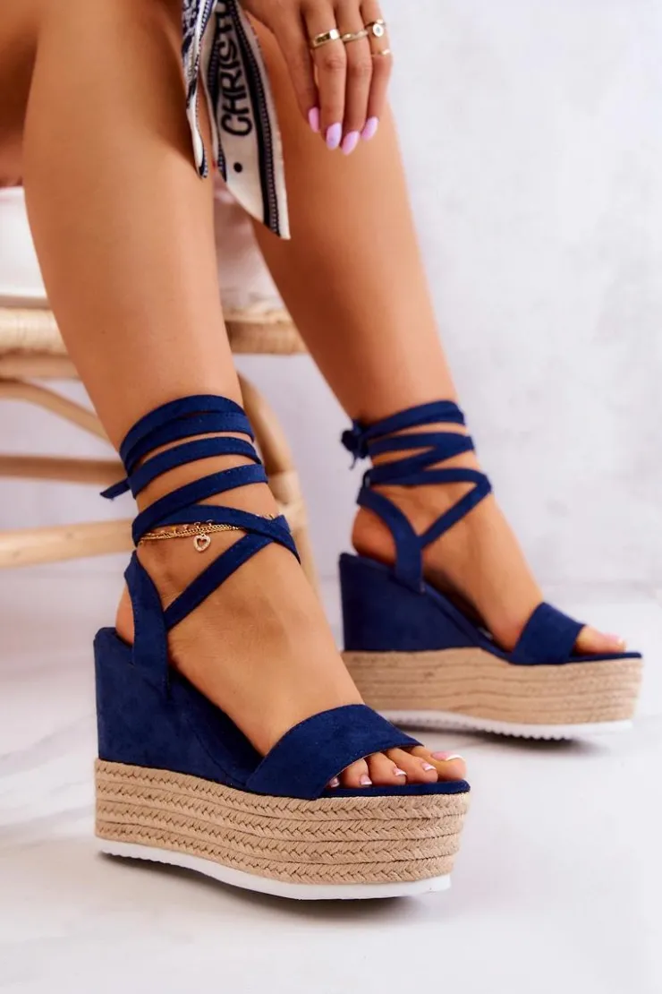 Piękne sandały na koturnie z lnianą plecionką. Bardzo lekkie i wygodne w użytkowaniu. Wiązane wokół kostki. Sandały zostały wykonane z zamszowej eko skóry. Posiadają podeszwę z tworzywa sztucznego. Wyjątkowy model wzbogaci Twoją letnią garderobę! Idealne do zwiewnych sukienek. Świetnie sprawdzą się w upalne dni. Miękka wkładka z zamszowej eko skóry zapewni Twoim stopom komfort. Przy wyborze rozmiaru prosimy sugerować się tabelą rozmiarów.