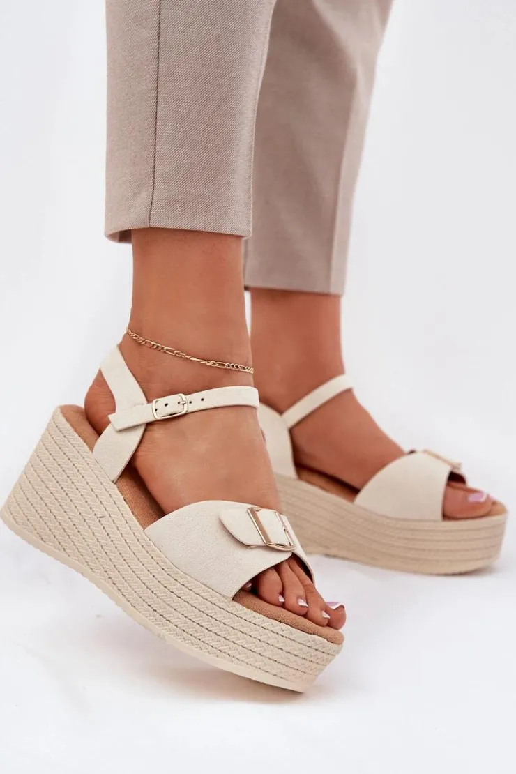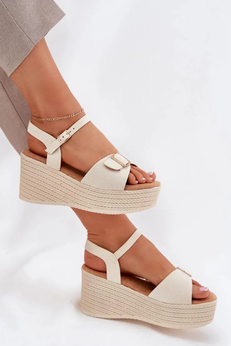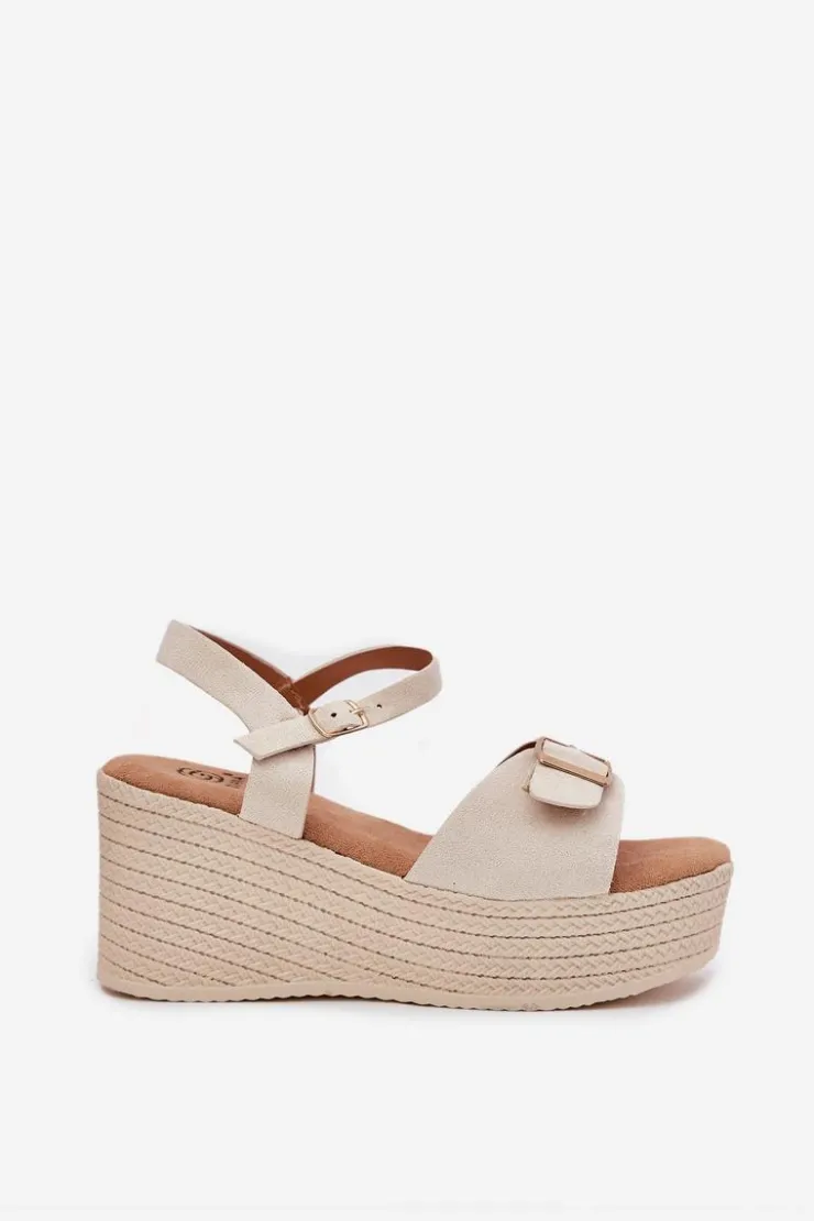 Damskie sandały wykonane z eko zamszu. Osadzone na koturnie i platformie z imitacją plecionki, zapewniają wygodę oraz stabilność przez cały dzień. Z przodu znajdują się ozdobna klamra, która dodaje im unikalnego charakteru. Model zapinany na sprzączkę umożliwia idealne dopasowanie do stopy, a miękka wkładka gwarantuje komfort. Te sandały będą doskonałym uzupełnieniem letnich stylizacji. Przy wyborze rozmiaru prosimy sugerować się tabelą rozmiarów.