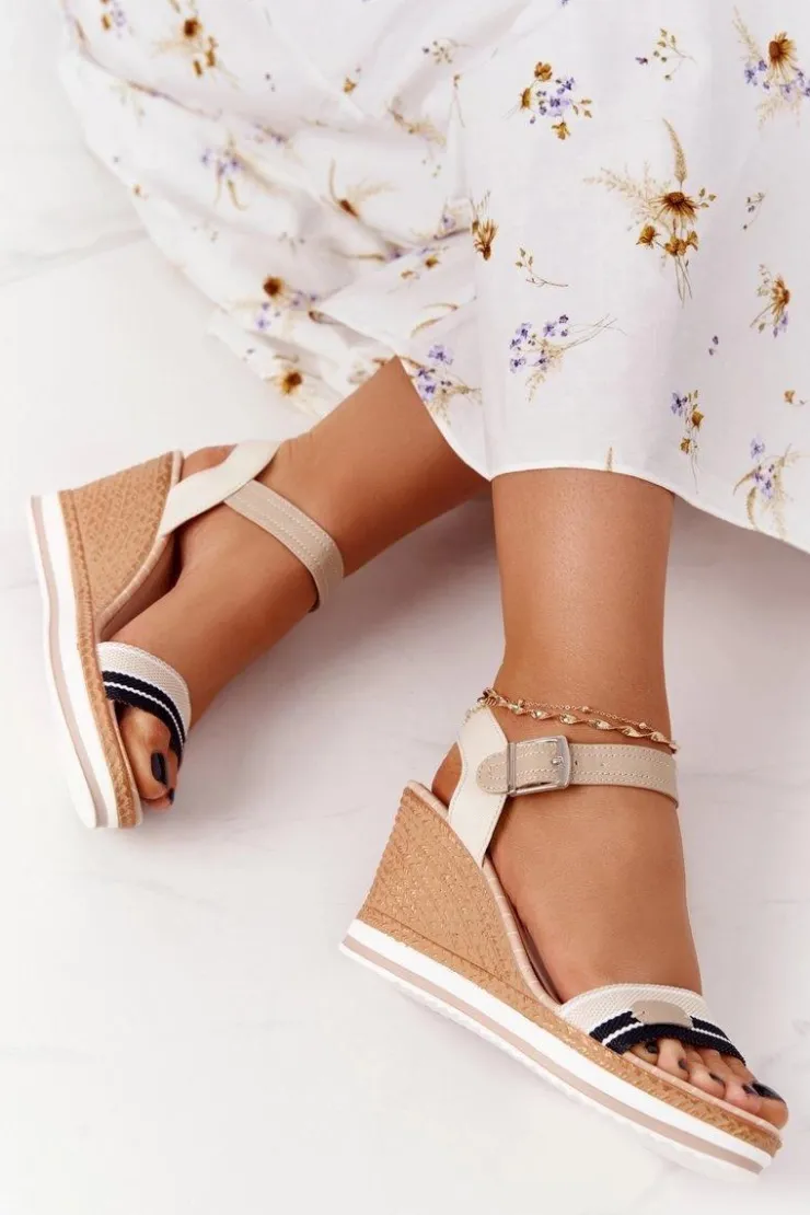 Piękne oraz wygodne sandały na koturnie wykonane z połączenia eko skóry, oraz tkaniny. Buty posiadają miękką wkładkę ze skóry ekologicznej. Modny fason w marynarskim stylu urozmaici Twoją letnią garderobę! Koniecznie sprawdź całą naszą kolekcję damskich sandałów. Przy wyborze rozmiaru prosimy sugerować się tabelą rozmiarów.