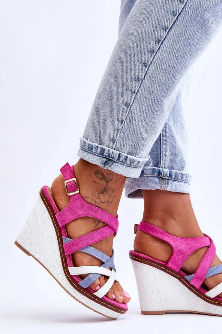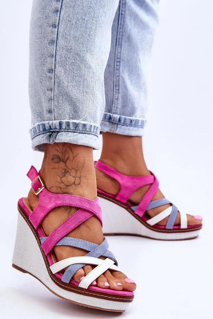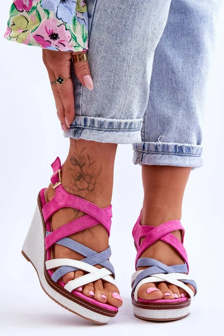 Wyjątkowe sandały damskie na platformie i koturnie. Cholewka została wykonana z eko skóry. Paseczki przeplatają się ze sobą tworząc wyjątkowy efekt. Buty posiadają miękką, eko skórzaną wkładkę. Sandałki są zapinane wokół kostki na sprzączkę z regulowanym paskiem. Podeszwa wykonana z tworzywa sztucznego jest antypoślizgowa, natomiast koturn wraz z platformą zostały ozdobione plecionką. Przy wyborze rozmiaru prosimy sugerować się tabelą rozmiarów.