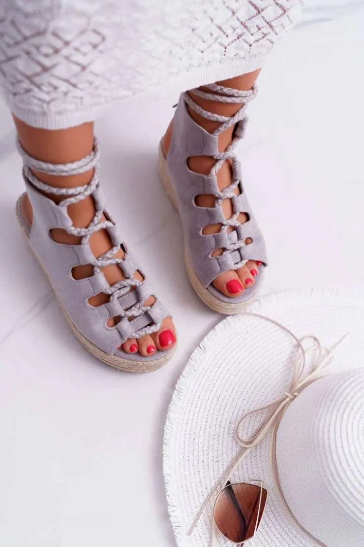 Boto Sandały Na Koturnie|Sandały Płaskie*Sandały Damskie Na Platformie Z Espadrylem Sznurowane Szare Grand