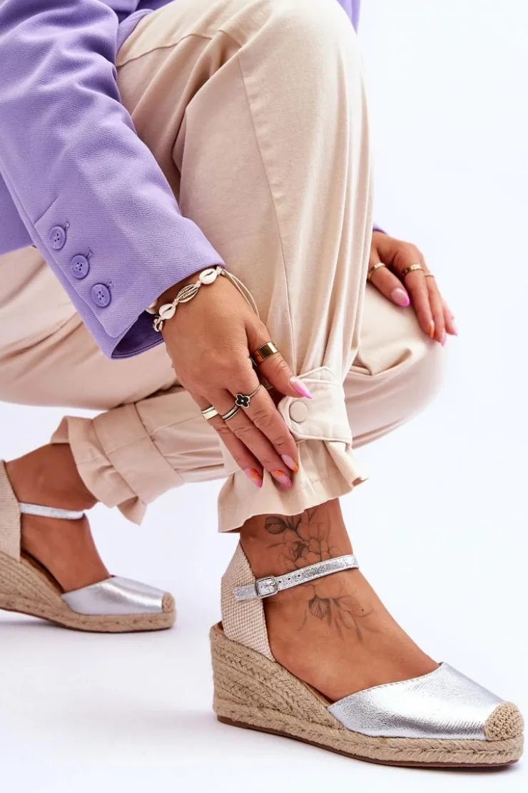 Boto Sandały Na Koturnie*Skórzane Sandałki Espadryle Na Koturnie Srebrne Cammer