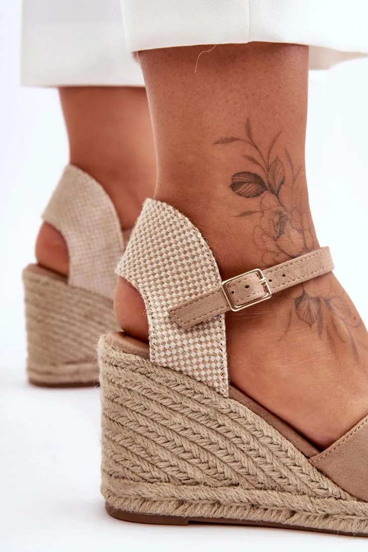 Modne sandały damskie zostały wykonane z połączenia eko zamszu oraz tkaniny. Sandałki te posiadają zapinanie w postaci regulowanego paska. Koturn i platforma zostały ozdobione jutową plecionką. Podeszwa w tych butach jest gumowa i antypoślizgowa. Miękka wkładka zadba o Twój komfort i wygodę. Przy wyborze rozmiaru prosimy sugerować się tabelą rozmiarów.
