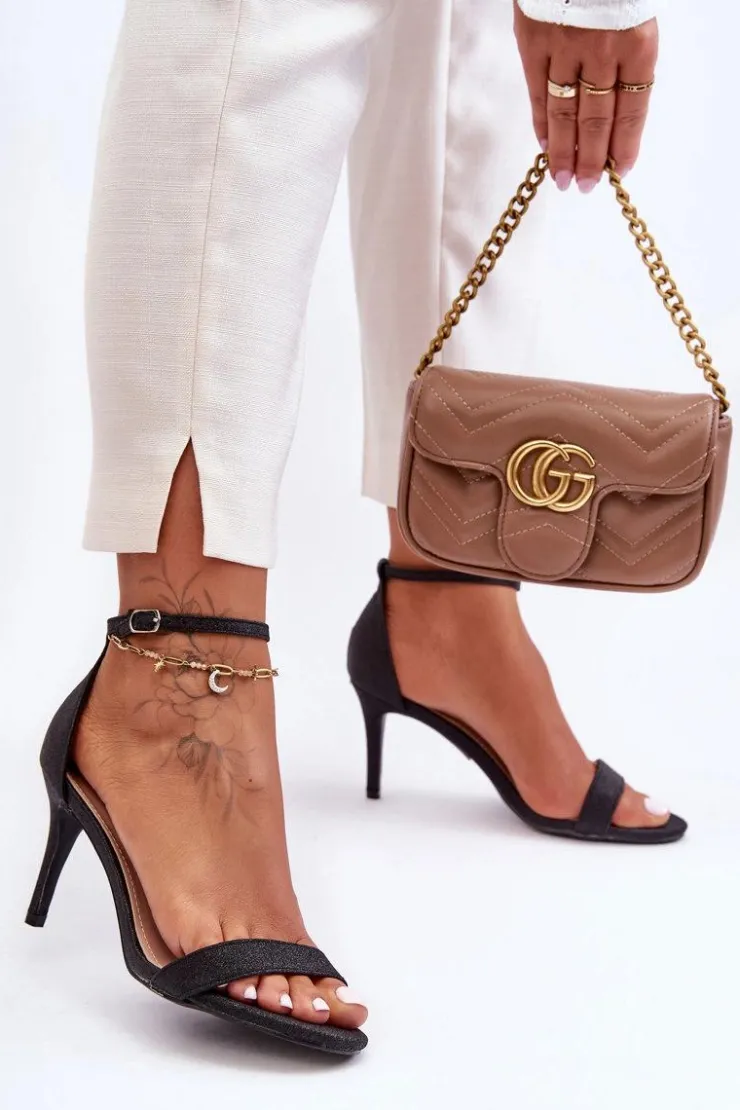 Klasyczne, brokatowe sandały zostały osadzone na obcasie w postaci szpilki. Model ten posiada usztywniany zapiętek oraz zapięcie na cienki pasek ze sprzączką. Wysoki obcas i miękka, eko skórzana wkładka zapewni dobre samopoczucie oraz gustowny wygląd. Przy wyborze rozmiaru prosimy sugerować się tabelą rozmiarów.