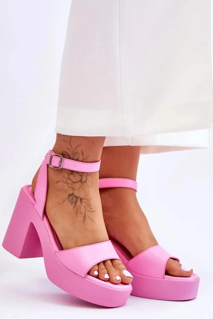Damskie, modne sandałki zostały wykonane z eko skóry. Model ten posiada klasyczne zapinanie na regulowany pasek ze sprzączką. Sandałki osadzono na masywnej platformie oraz obcasie w postaci szerokiego słupka. Model ten posiada na przodzie szerszy paseczek. Miękka wkładka z eko skóry zapewni wygodne użytkowanie. Przy wyborze rozmiaru prosimy sugerować się tabelą rozmiarów.