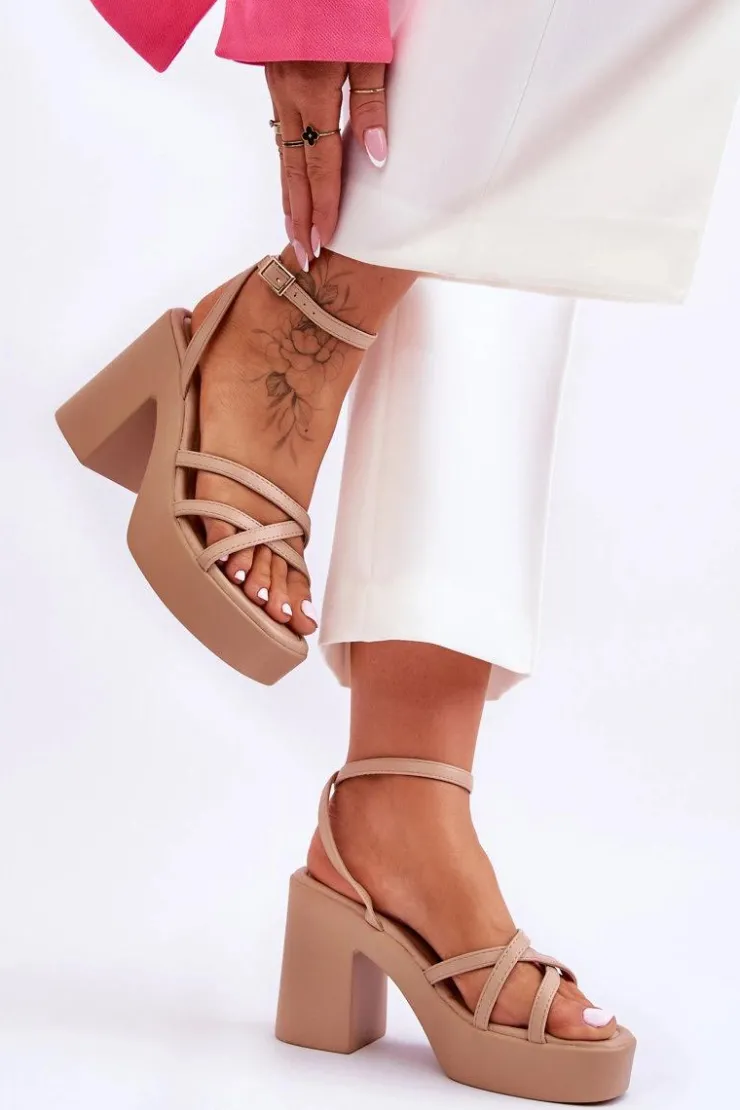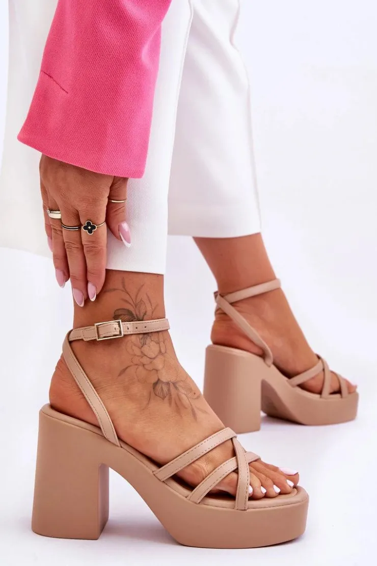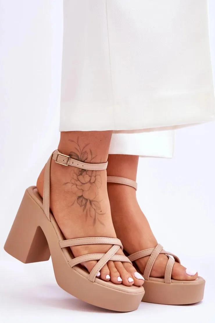 Wyjątkowe, damskie sandały zostały wykonane z eko skóry. Model ten posiada zapinanie wokół kostki na regulowany pasek ze sprzączką i jest niezwykle lekki. Sandałki osadzono na platformie oraz masywnym, szerokim słupku. Wygodna wkładka została wykonana także z eko skóry. Przy wyborze rozmiaru prosimy sugerować się tabelą rozmiarów.