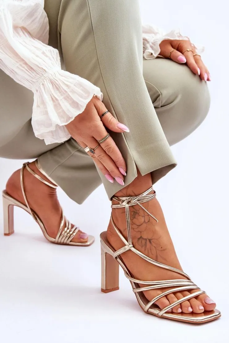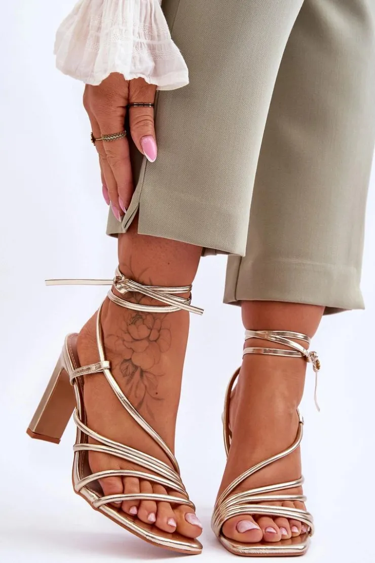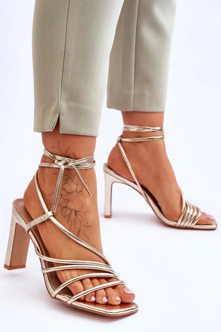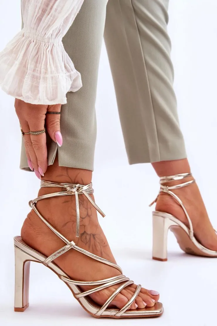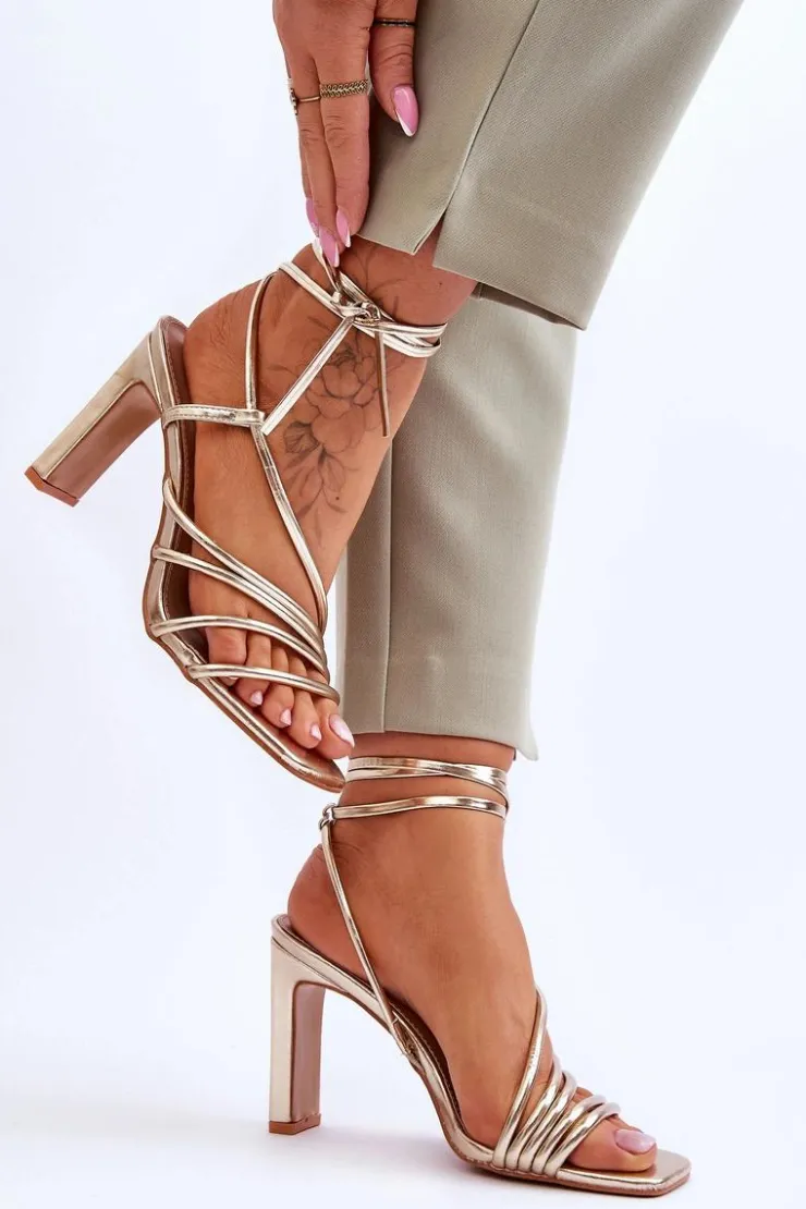 Eleganckie sandały damskie zostały wykonane z eko skóry. Model posiada wiązanie wokół łydki. Sandałki osadzono na płaskim obcasie w postaci słupka. Miękka wkładka z eko skóry zapewni komfortowe użytkowanie obuwia. Sandałki posiadają odkryty, kwadratowy nosek. Ten fason świetnie sprawdzi się do letnich sukienek czy eleganckich spodni. Przy wyborze rozmiaru prosimy sugerować się tabelą rozmiarów.
