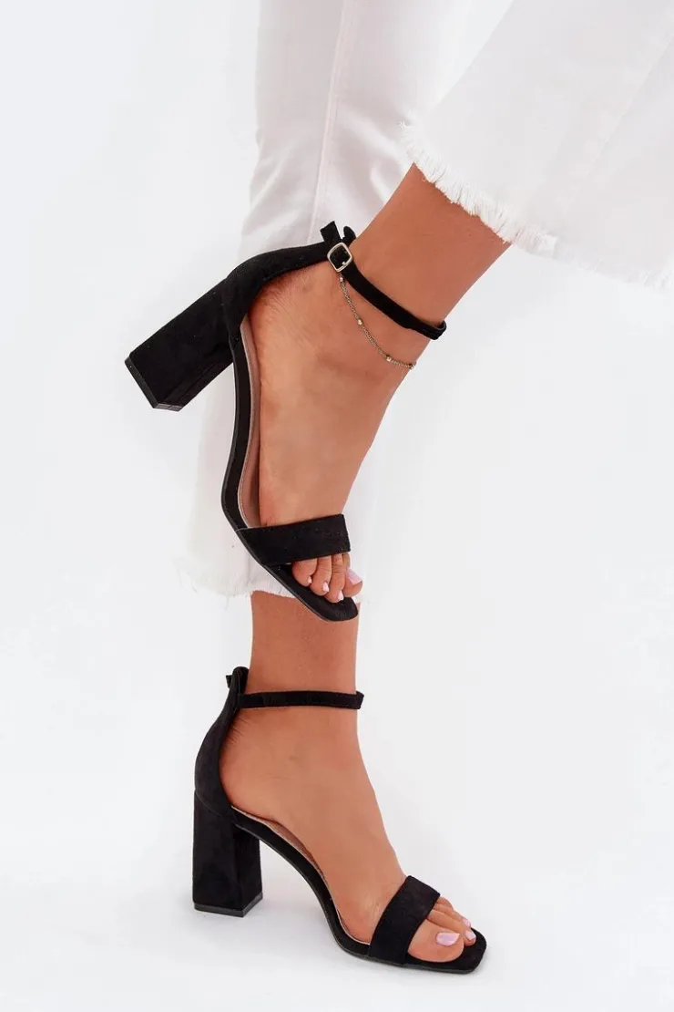 Sandały damskie z eko zamszu, osadzone na słupkowym obcasie, to klasyczna propozycja na różne okazje. Zapinane na sprzączkę z regulowanym paskiem, zapewniają idealne dopasowanie i komfort przez cały dzień. Doskonałe na wieczorne wyjścia, wesela czy inne uroczystości. Przy wyborze rozmiaru prosimy kierować tabelą rozmiarów.