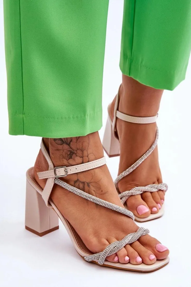 Damskie sandały zostały wykonane z eko skóry. Posiadają z przodu przeplatające się paski z dżetami imitującymi cyrkonie oraz paseczek znajdujący się na środku sandałek. Wygodna wkładka z eko skóry pozwoli na komfortowe użytkowanie obuwia. Buty posiadają regulowany pasek zapinany na sprzączkę wokół kostki. Ten model powinien być Twój! Przy wyborze rozmiaru prosimy sugerować się tabelą rozmiarów.