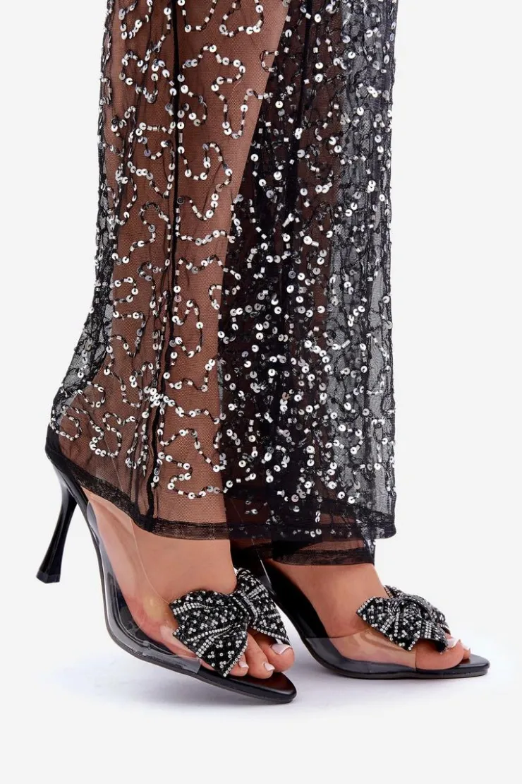 Eleganckie transparentne sandały na szpilce, które idealnie podkreślą wyjątkowy charakter Twojej stylizacji. Model wyróżnia się efektowną, błyszczącą kokardą z przodu, dodającą odrobinę glamour. Model ten doskonale komponują się z sukniami koktajlowymi oraz eleganckimi kompletami, tworząc szykowny i modny look. Przy wyborze rozmiaru prosimy sugerować się tabelą rozmiarów.