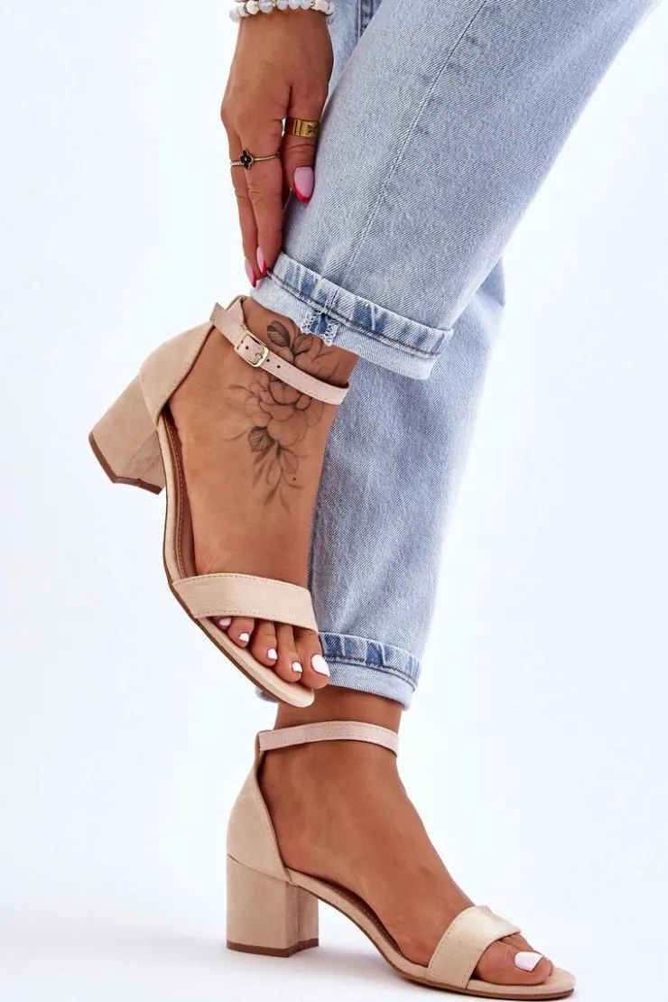 Wyjątkowe sandałki na niewysokim obcasie w postaci stabilnego słupka. Wykonane z przyjemnego w dotyku eko zamszu. Sandałki te posiadają usztywniany zapiętek. Wkładka wykonana z eko skóry zapewni komfortowe użytkowanie. Nosek odkryty, zaokrąglony. Zapinane wokół kostki na regulowany pasek ze sprzączką. Na pewno wykorzystasz je w wielu sytuacjach! Przy wyborze rozmiaru prosimy sugerować się tabelą rozmiarów.