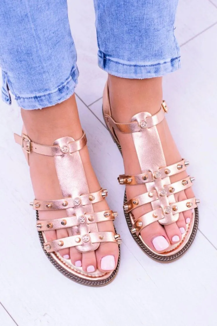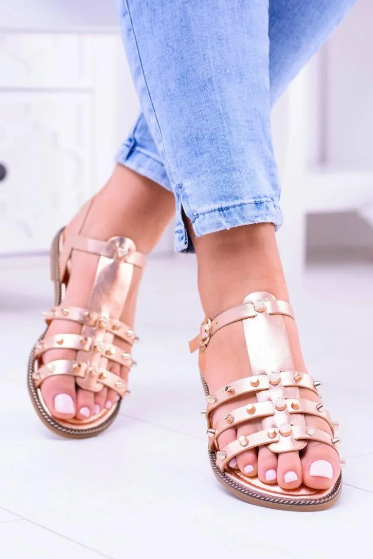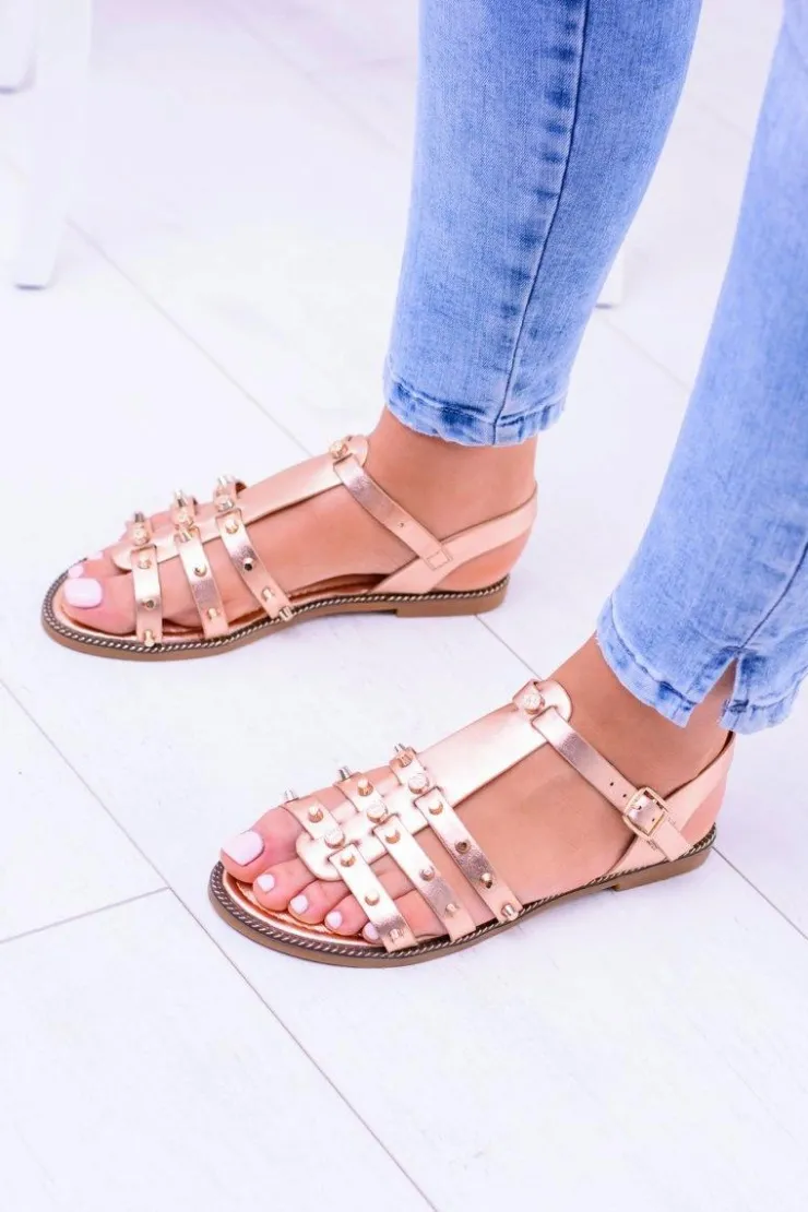 Boto Sandały Płaskie*Damskie Sandałki z Ćwiekami Aglet Różowe Złoto