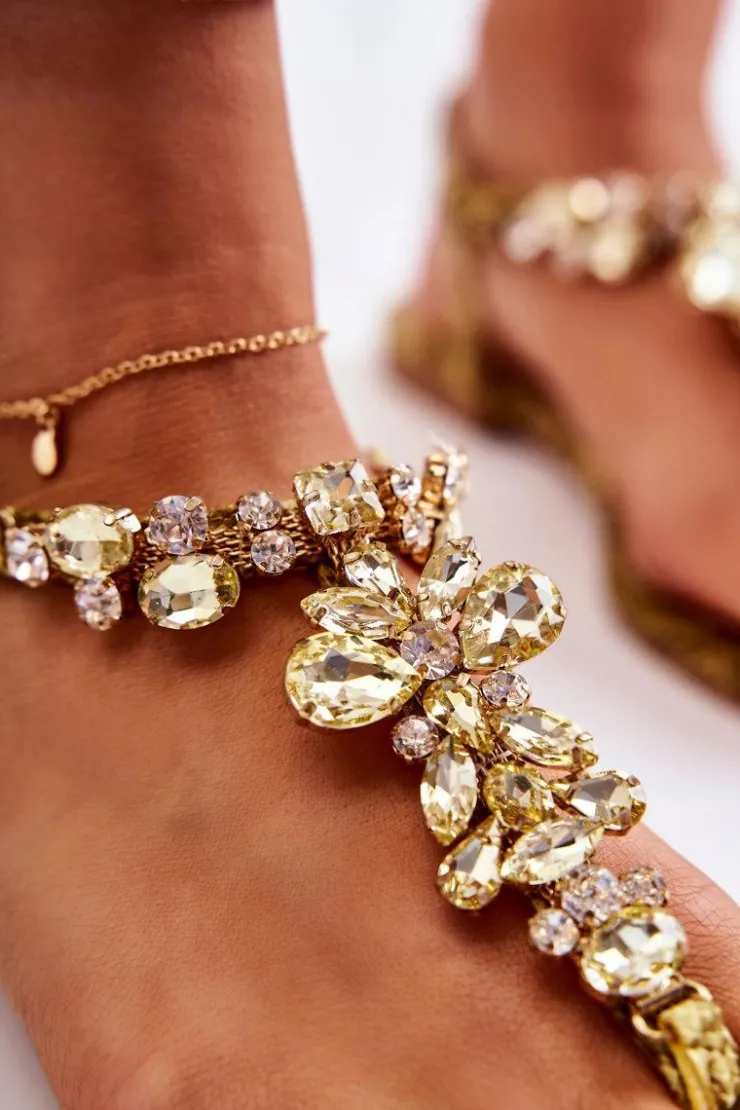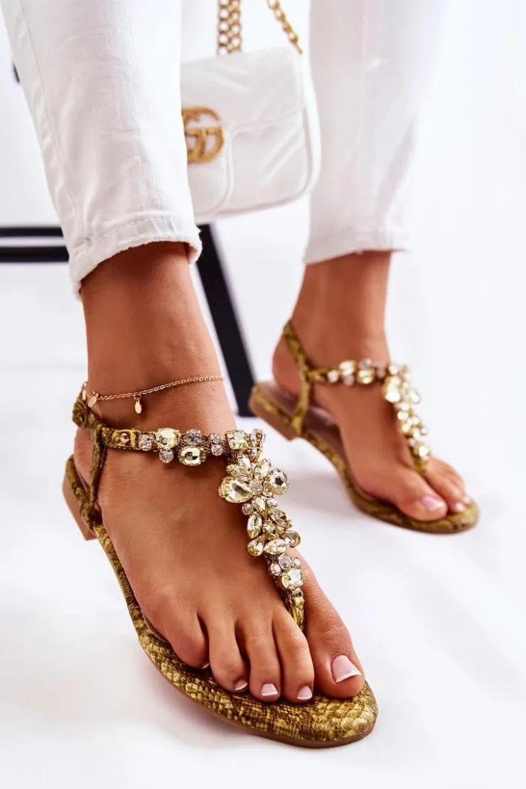 Sandały typu japonki na płaskim obcasie. Posiadają otwarty, zaokrąglony nosek. Cienkie paski zostały wykonane z eko skóry. Model zapinany na sprzączkę z regulowanym paskiem, dzięki któremu możesz je odpowiednio dopasować do tęgości nogi. Ozdobione dżetami na paskach imitującymi cyrkonie i kryształy. Miękka wkładka wykonana także z eko skóry. Sandały świetnie będą prezentować się z wieloma stylizacjami! Przy wyborze rozmiaru prosimy kierować się tabelą rozmiarów.