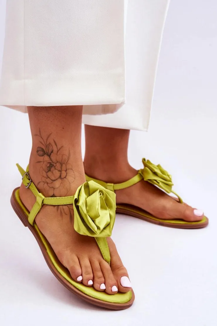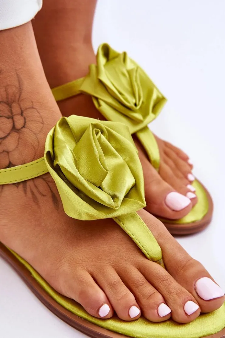 Damskie sandałki zostały wykonane z materiału tekstylnego imitującego satynę. Ozdobione na środku dużą, materiałową różą. Sandałki w stylu japonek osadzono na płaskim obcasie. Zapinane są na regulowany pasek ze sprzączką. Miękka wkładka została wykonana z materiału. Przy wyborze rozmiaru prosimy kierować się tabelą rozmiarów.