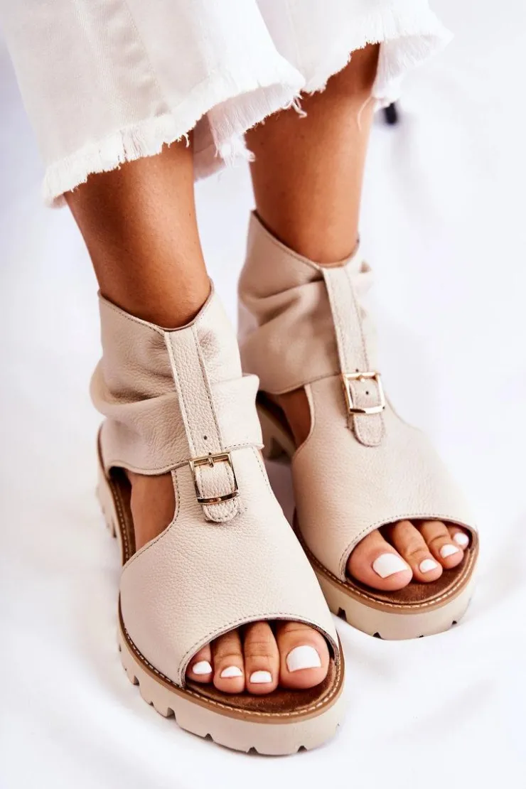Wyjątkowe sandały z cholewką za kostkę. Posiadają paseczek ze sprzączką na środku. Z tyłu są zapinane na suwak. Po bokach znajdują się wycięcia. Nosek odkryty, zaokrąglony. Buty zostały osadzone na płaskim obcasie i delikatnej platformie. Ciekawy fason, który powinien znaleźć się w Twojej szafie! Miękka wkładka z naturalnej skóry zapewni wygodę podczas użytkowania. Przy wyborze rozmiaru prosimy sugerować się tabelą rozmiarów.