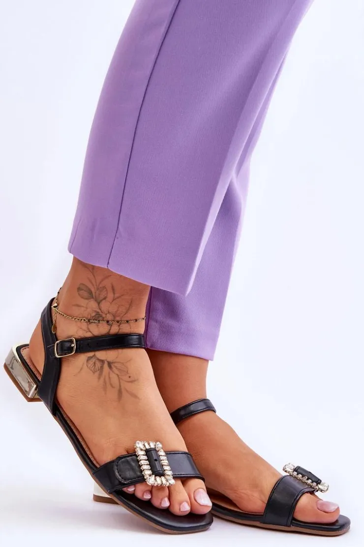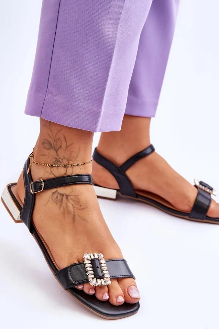 Klasyczne sandałki damskie zostały wykonane z eko skóry. Model ten posiada zdobienie na paseczku z przodu z kryształkami. Sandałki są zapinane na regulowany pasek ze sprzączką. Wkładka z eko skóry zapewni komfort podczas użytkowania obuwia. Sandałki osadzono na płaskim, lustrzanym obcasie z antypoślizgową podeszwą. Przy wyborze rozmiaru prosimy kierować się tabelą rozmiarów.