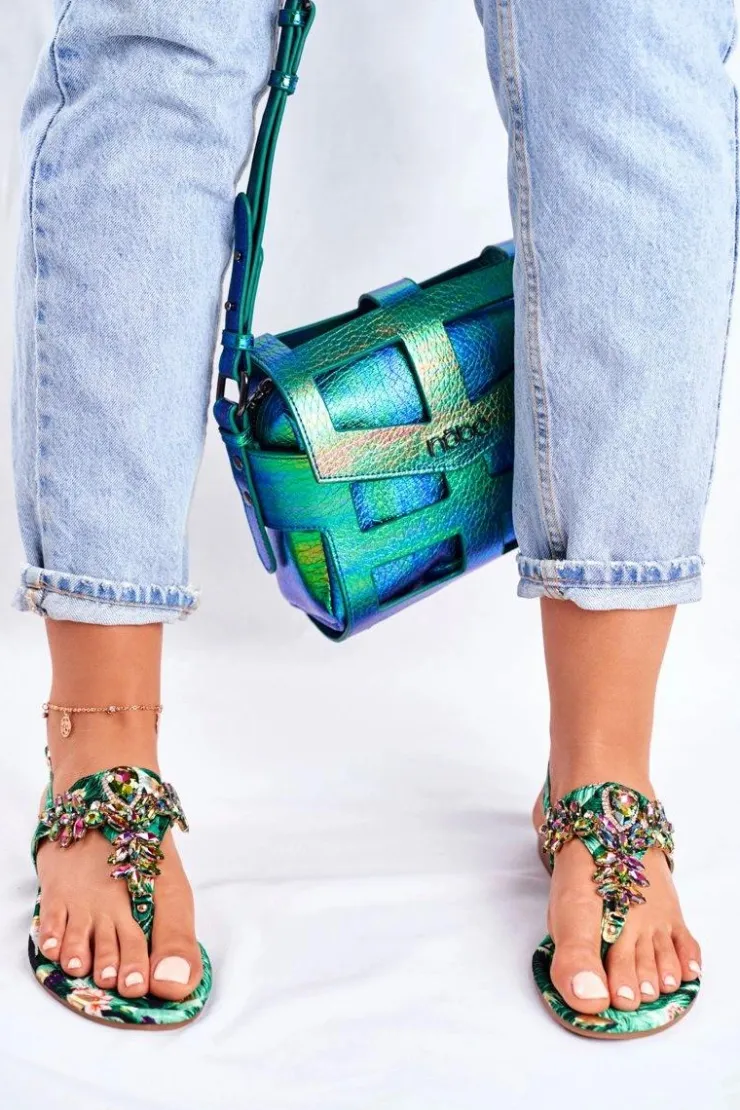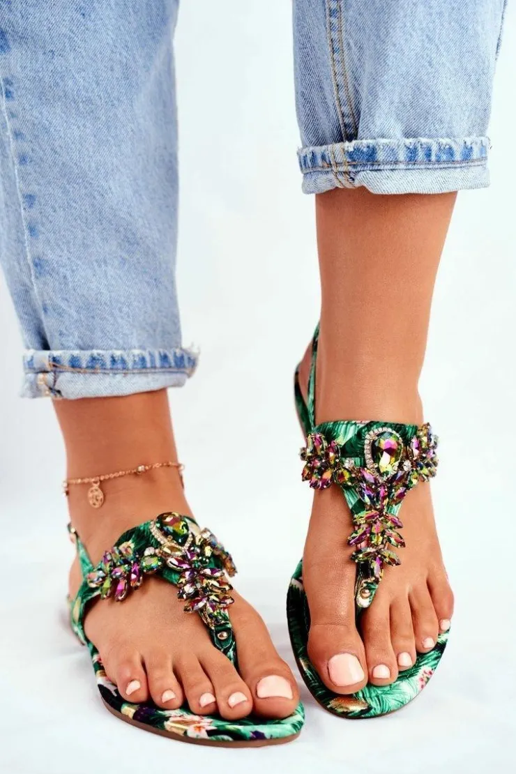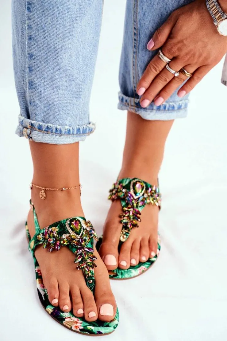 Boto Sandały Płaskie*Sandałki Damskie Eleganckie Japonki Kryształki Zielone Under Control