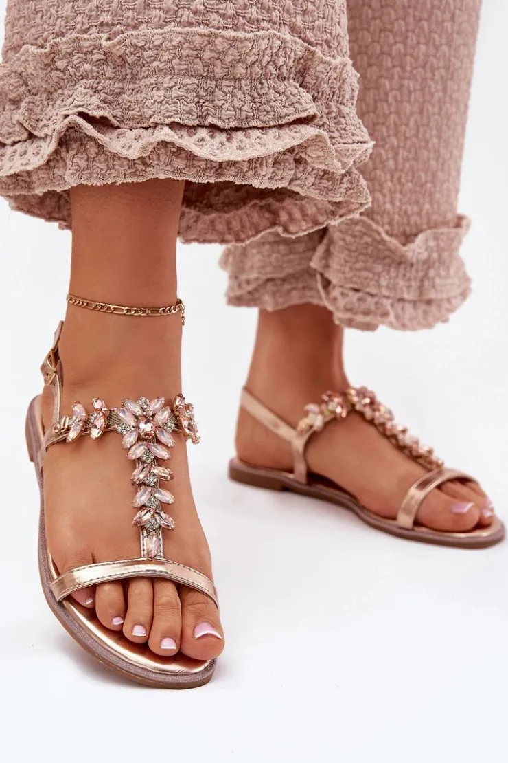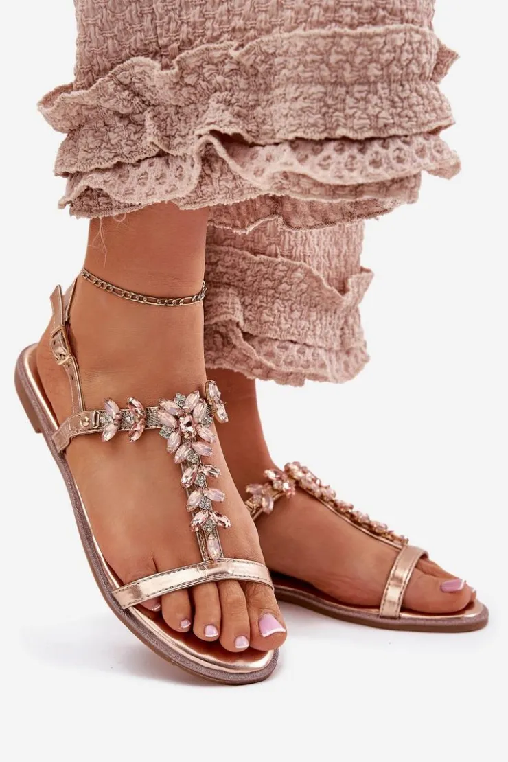 Sandały damskie z eko skóry na płaskim obcasie to doskonała propozycja na ciepłe dni. Zapinane na sprzączkę z regulowanym paskiem, zapewniają łatwe dopasowanie do stopy. Model wyróżnia się ozdobnymi kryształkami, a brokat przy podeszwie wprowadza odrobinę wyjątkowego uroku. Idealne do letnich stylizacji. Przy wyborze rozmiaru prosimy kierować się tabelą rozmiarów.