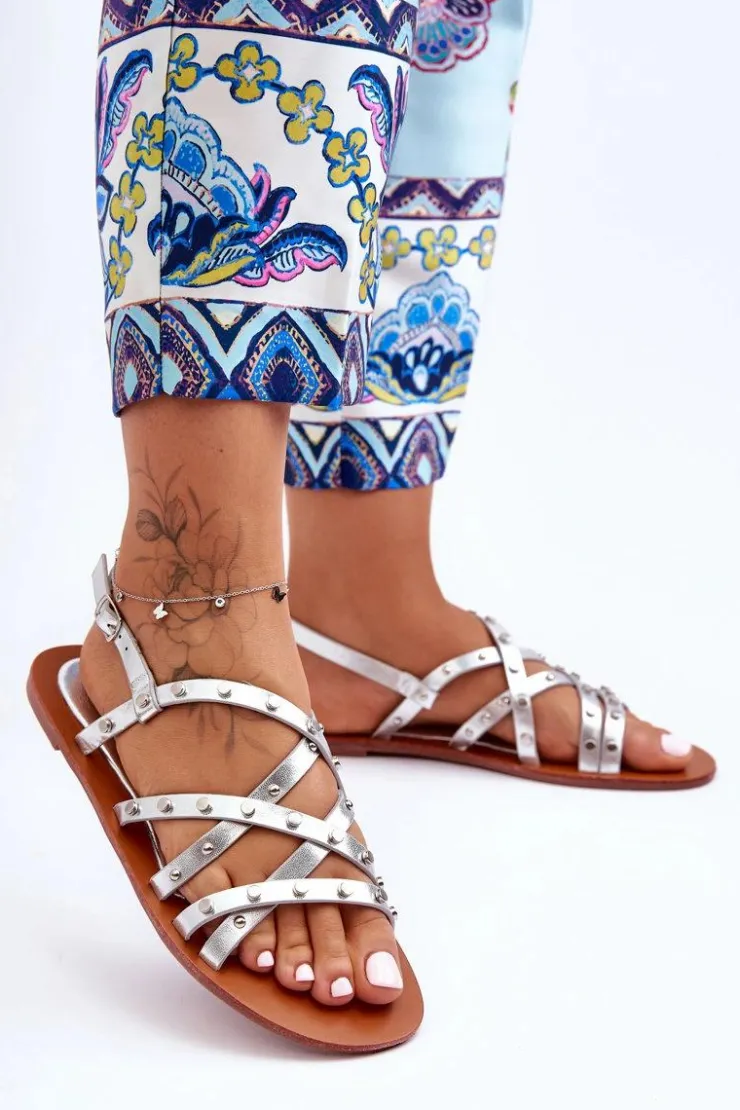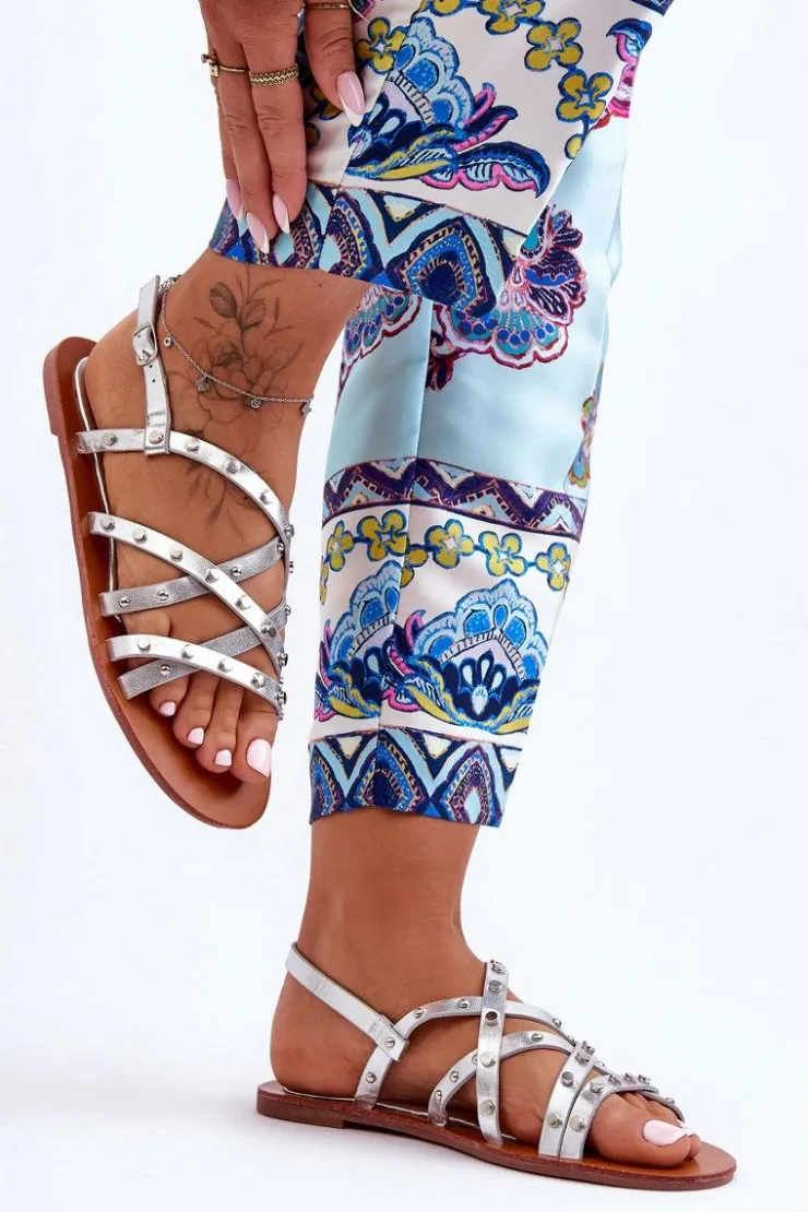 Boto Sandały Płaskie*Sandały Damskie z Ozdobami Srebrne Alemona
