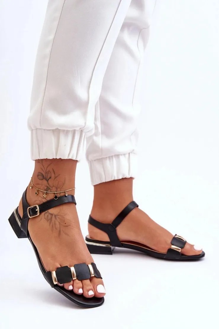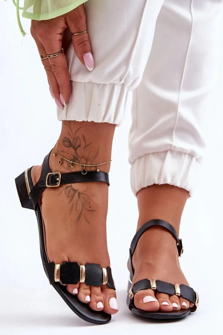Klasyczne, damskie sandały zostały wykonane z eko skóry. Model ten zapinany jest na regulowany pasek ze sprzączką. Z przodu na pasku znajdują się złote metalowe ozdoby. Wygodna wkładka zapewni komfort podczas użytkowania obuwia. Przy wyborze rozmiaru prosimy kierować się tabelą rozmiarów.