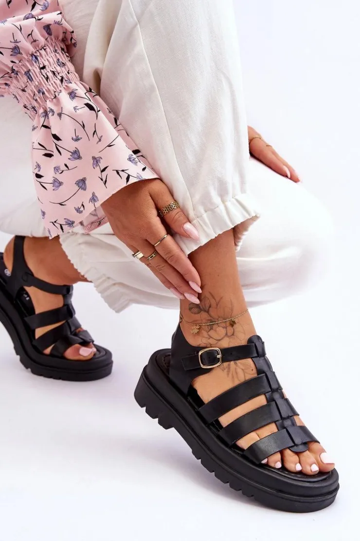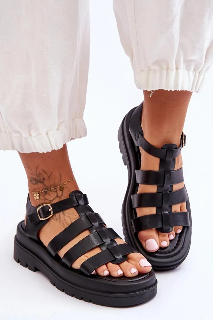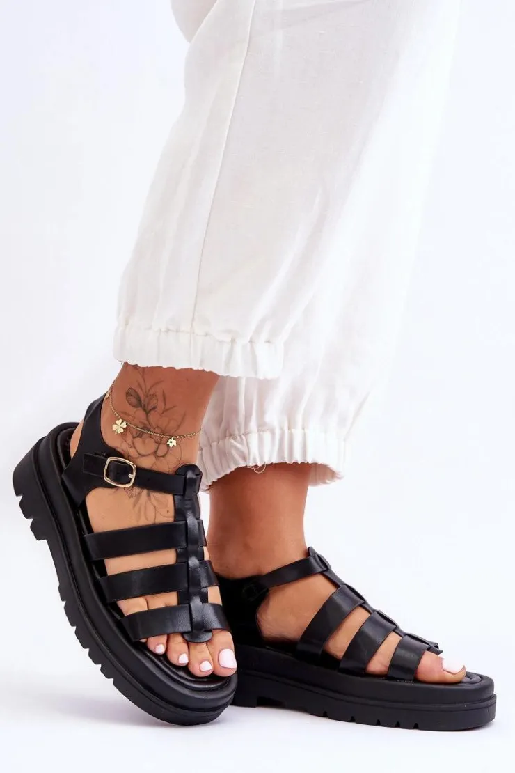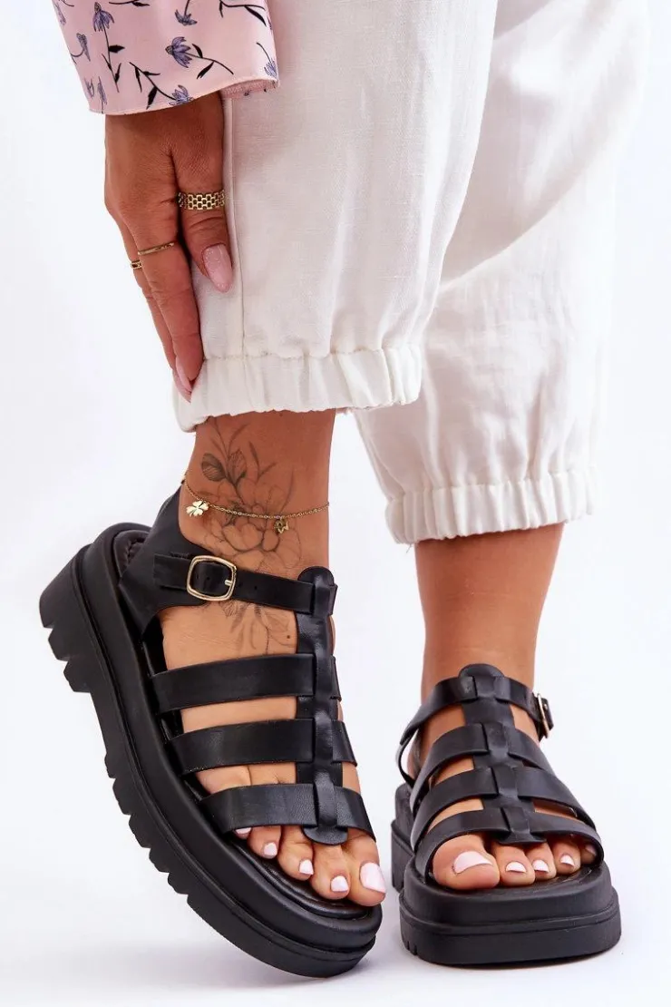 Przewiewne sandały damskie zostały wykonane z eko skóry. Zapinane na regulowany pasek ze sprzączką. Sandałki posiadają odkryty, lekko kwadratowy nosek oraz odkrytą piętę. Miękka, eko skórzana wkładka zapewni wygodę podczas użytkowania. Płaski obcas oraz platforma sprawiają, że buty są niezwykle stabilne. Te sandałki to idealny fason na upalne dni. Świetnie będą prezentować się z zarówno ze spodniami, jak i sukienkami. Przy wyborze rozmiaru prosimy sugerować się tabelą rozmiarów.
