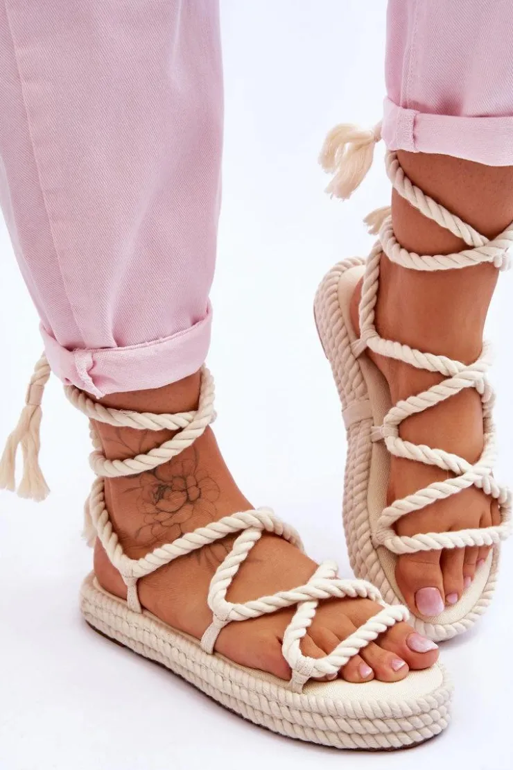Wygodne sandałki zostały wykonane z miękkiej tkaniny. Posiadają paski w formie sznureczków zakończonych frędzelkami. Sandałki są wiązane wokół łydki. Dodatkowo posiadają miękką wkładkę wykonaną z tkaniny. Model ten został osadzony na platformie. Sandałki świetnie sprawdzą się w stylizacjach boho. Przy wyborze rozmiaru prosimy sugerować się tabelą rozmiarów.
