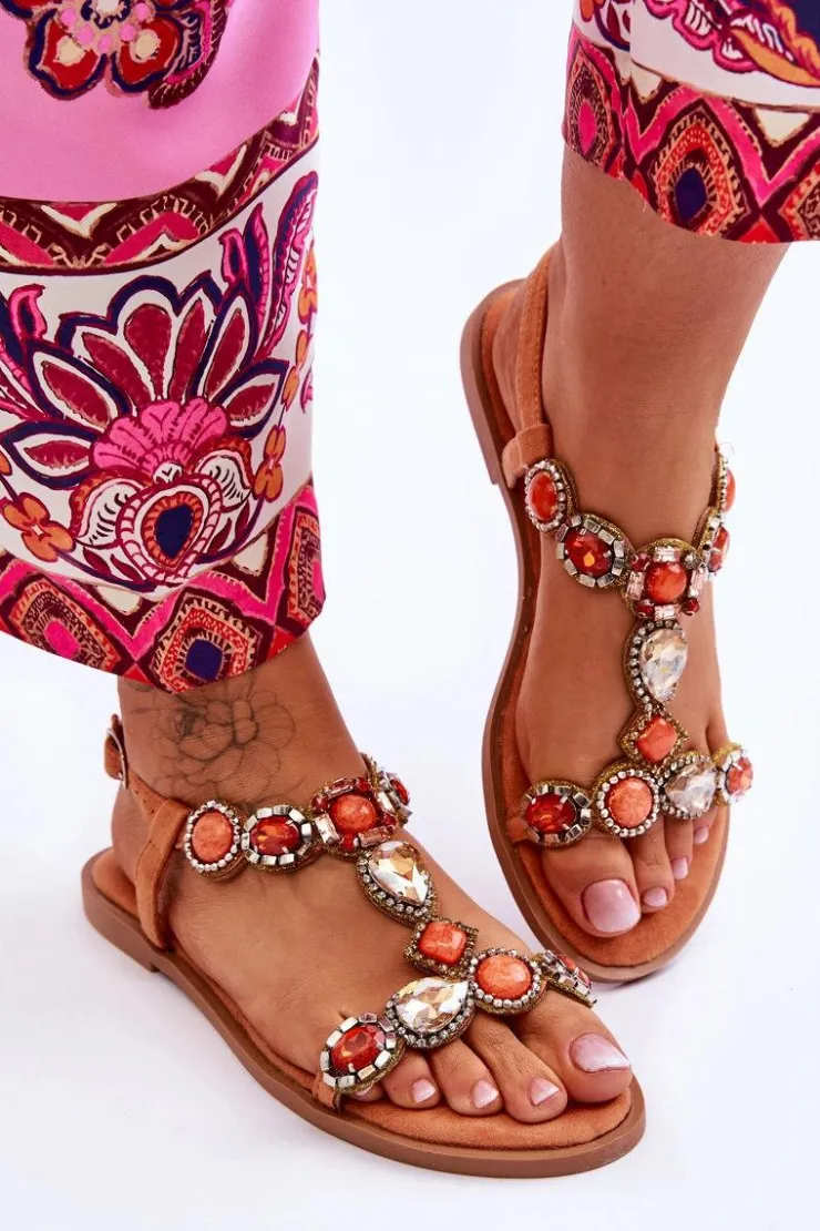 Piękne, damskie sandałki zostały wykonane z miłego w dotyku eko zamszu. Model ten posiada zdobienia w postaci brokatu, kamieni i mieniących się dżetów. Sandałki są zapinane na regulowany pasek ze sprzączką. Wygodna wkładka z eko zamszu świetnie sprawdzi się podczas długiego użytkowania obuwia. Sandałki osadzono na płaskim obcasie z antypoślizgową podeszwą. Przy wyborze rozmiaru prosimy kierować się tabelą rozmiarów.
