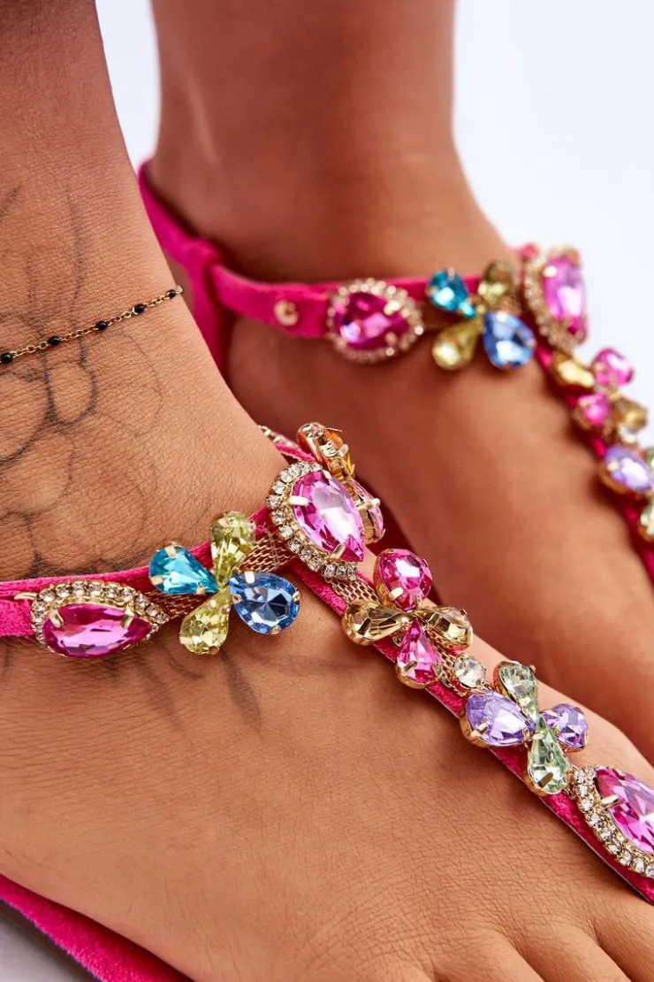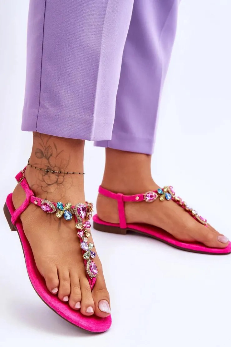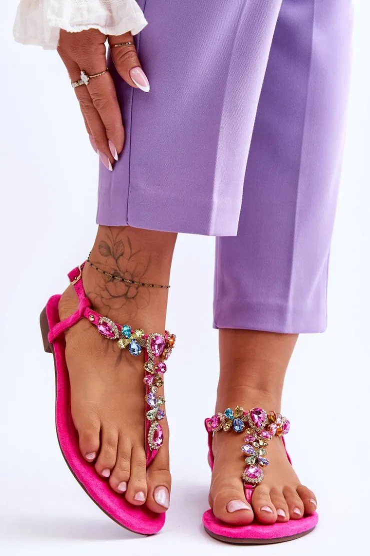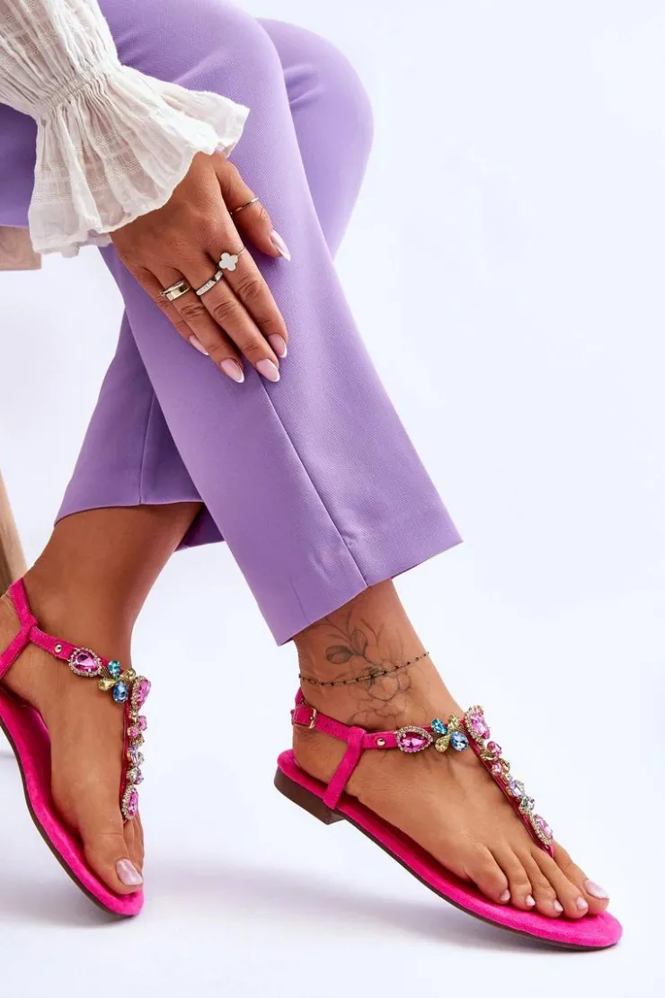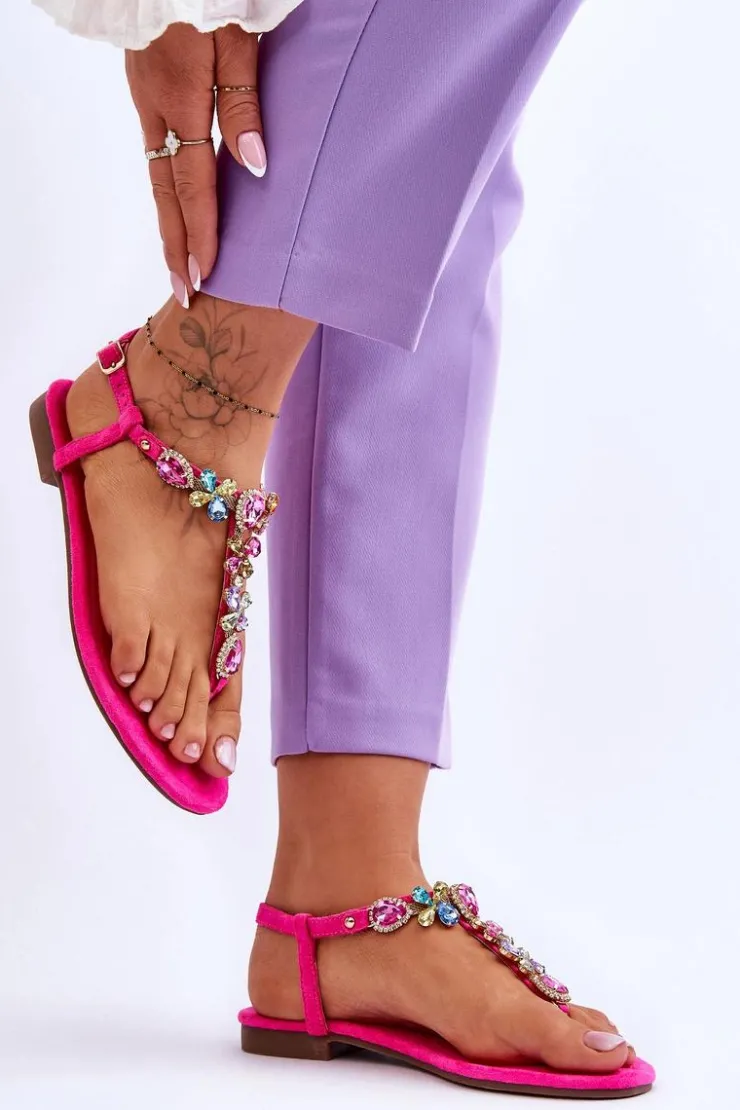 Boto Sandały Płaskie*Zamszowe Sandały Japonki Z Kamieniami Różowe Frency